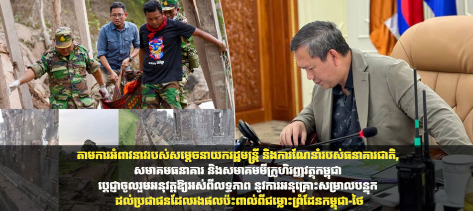 តាមការអំពាវនាវរបស់សម្តេចនាយករដ្ឋមន្ត្រី និងការណែនាំរបស់ធនាគារជាតិ, សមាគមធនាគារ និងសមាគមមីក្រូហិរញ្ញវត្ថុកម្ពុជា ប្តេជ្ញាចូលរួមអនុវត្តឱ្យអស់ពីលទ្ធភាព នូវការអនុគ្រោះសម្រាលបន្ទុក ដល់ប្រជាជនដែលរងផលប៉ះពាល់ពីជម្លោះព្រំដែនកម្ពុជា-ថៃ Posted on ថ្ងៃពុធ, 30 ខែកក្កដា, 2025ថ្ងៃពុធ, 30 ខែកក្កដា, 2025