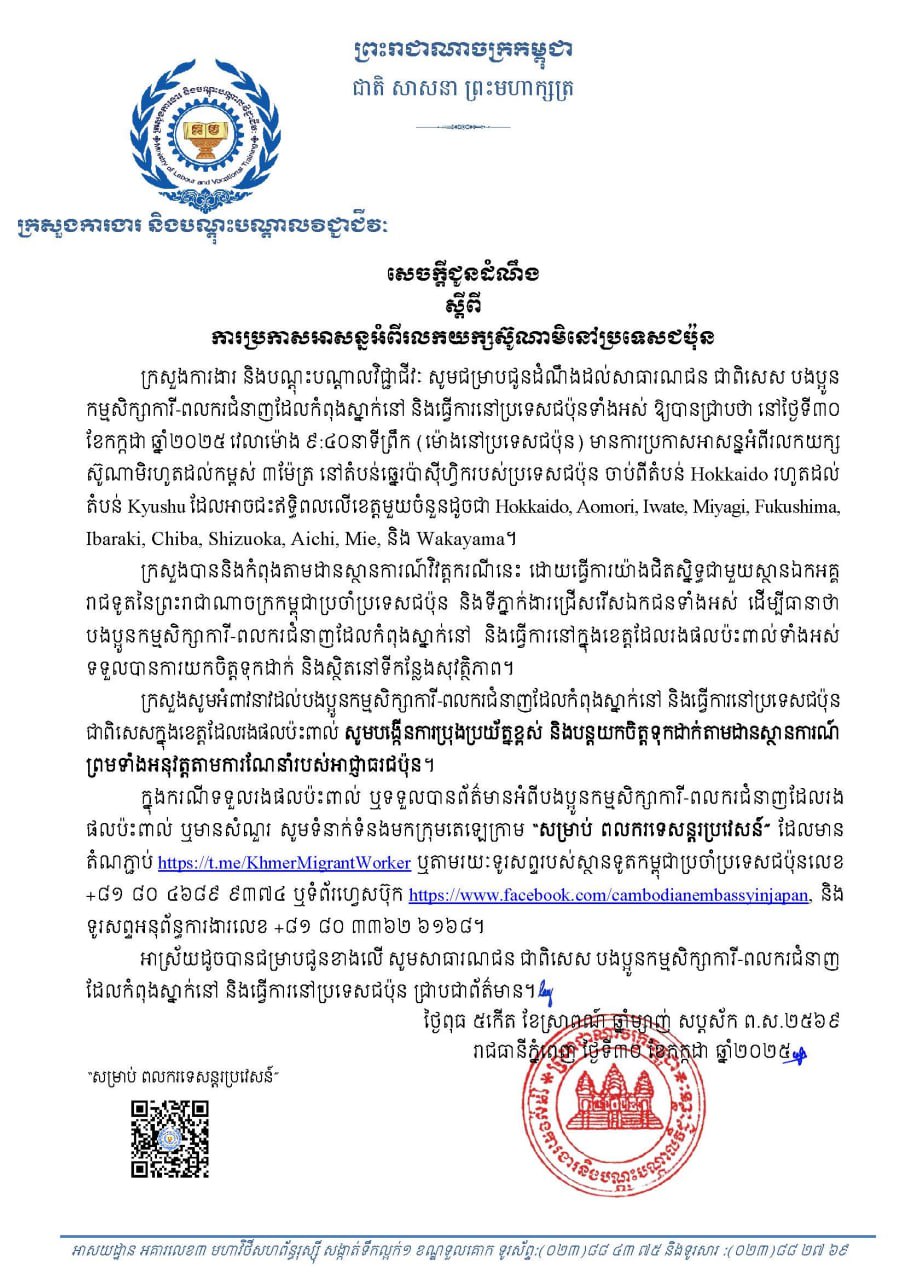 ក្រសួងការងារ ចេញសេចក្តីជូនដំណឹងស្តីពី ការប្រកាសអាសន្នអំពីរលកយក្សស៊ូណាមិនៅប្រទេសជប៉ុន Posted on ថ្ងៃពុធ, 30 ខែកក្កដា, 2025ថ្ងៃពុធ, 30 ខែកក្កដា, 2025