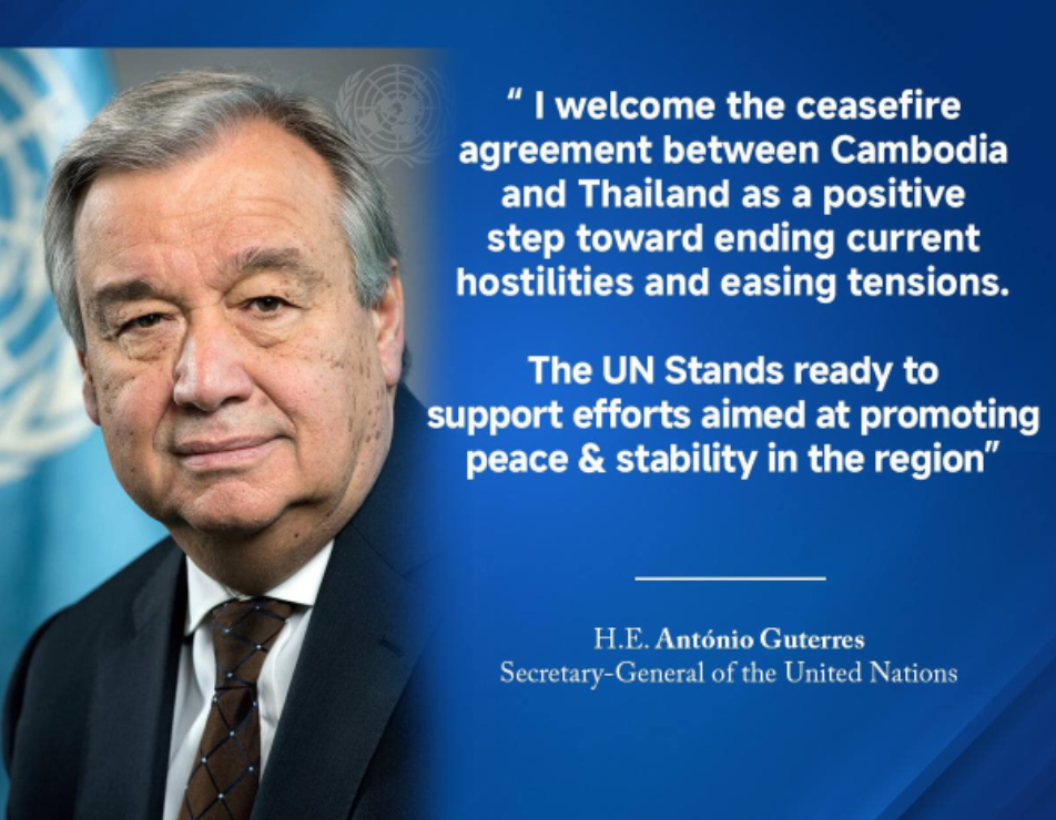 ប្រមុខ UN សាទរបទឈប់បាញ់រវាងកម្ពុជា និងថៃ Posted on ថ្ងៃពុធ, 30 ខែកក្កដា, 2025ថ្ងៃពុធ, 30 ខែកក្កដា, 2025