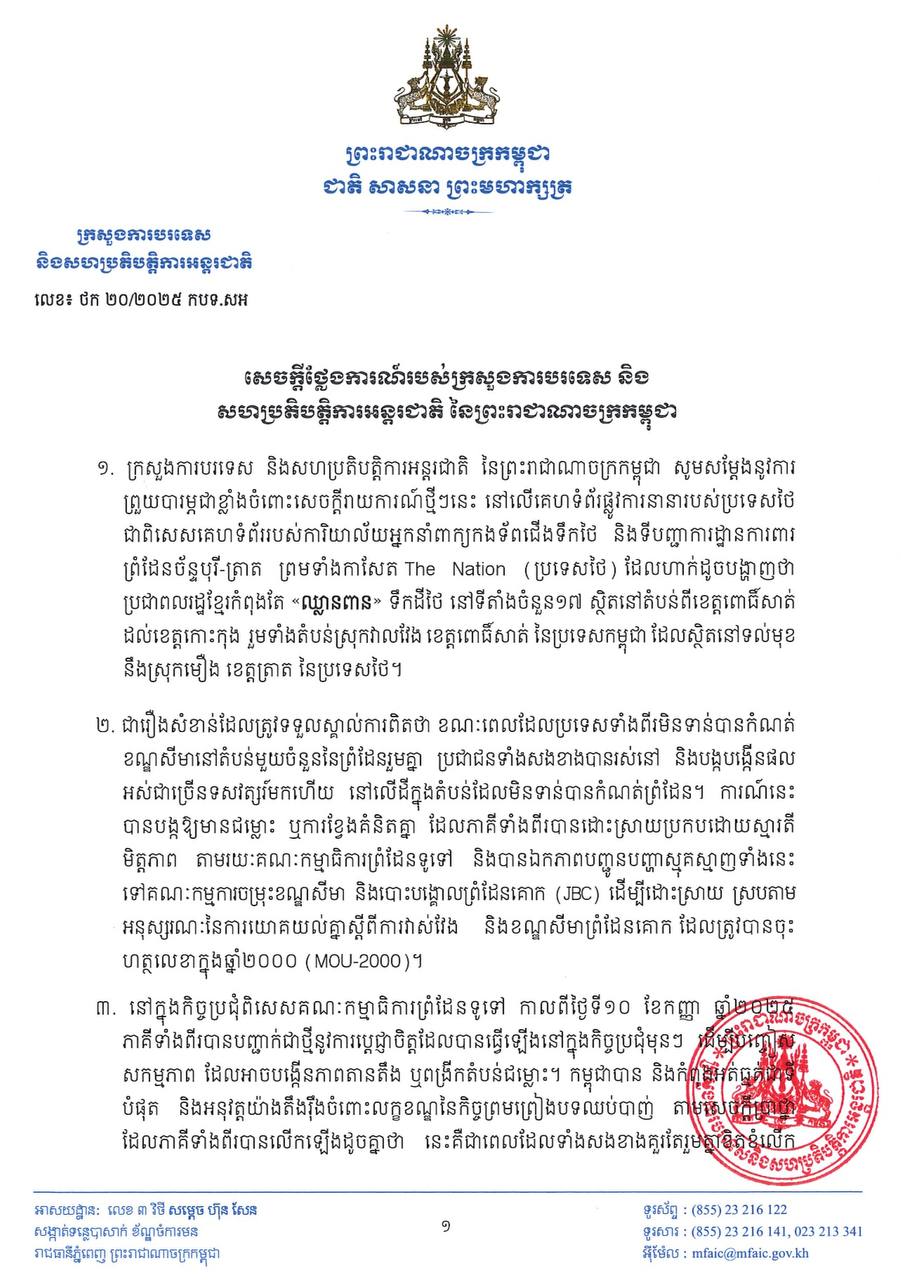 ក្រសួងការបរទេសកម្ពុជា ចេញសេចក្តីថ្លែងការណ៍សម្តែងនូវការព្រួយបារម្ភជាខ្លាំងចំពោះសេចក្តីរាយការណ៍នៅលើគេហទំព័រផ្លូវការនានារបស់ប្រទេសថៃ ដែលហាក់ដូចបង្ហាញថា ប្រជាពលរដ្ឋខ្មែរកំពុងតែ «ឈ្លានពាន» ទឹកដីថៃ នៅទីតាំងចំនួន១៧ Posted on ថ្ងៃព្រហស្បតិ៍, 25 ខែកញ្ញា, 2025ថ្ងៃព្រហស្បតិ៍, 25 ខែកញ្ញា, 2025