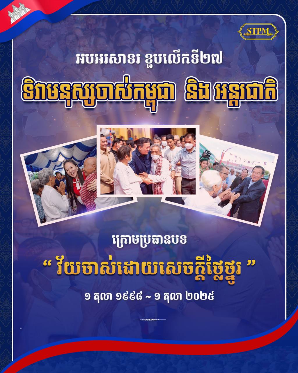 សម្តេចបវរធិបតី ហ៊ុន ម៉ាណែត អបអរសាទរខួបលើកទី២៧ ទិវាមនុស្សចាស់កម្ពុជា និងទិវាមនុស្សចាស់អន្តរជាតិ ក្រោមប្រធានបទ៖ «វ័យចាស់ដោយសេចក្ដីថ្លៃថ្នូរ» Posted on ថ្ងៃពុធ, 1 ខែតុលា, 2025ថ្ងៃពុធ, 1 ខែតុលា, 2025