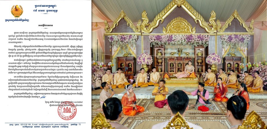 ក្រសួងវប្បធម៌ អំពាវនាវដល់គ្រប់អ្នកសិល្បៈ និងអ្នករៀបចំពិធីមង្គលការ សូមរក្សាឱ្យបាននូវការគោរព និងការអនុវត្តតាមពិធីដើម កុំកែច្នៃប្រាសចាកពីទំនៀមទម្លាប់ Posted on ថ្ងៃចន្ទ, 23 ខែកុម្ភៈ, 2026ថ្ងៃចន្ទ, 23 ខែកុម្ភៈ, 2026