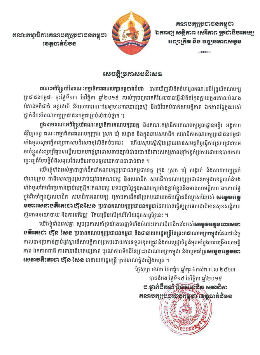 CPP ខេត្តបាត់ដំបង ប្រកាសបដិសេធលើលិខិតចំហ ប្រឌិតដោយក្រុមប្រឆាំង ដែលស្នើឱ្យ CPP បោះឆ្នោតដកសេចក្តីទុកចិត្តលើសម្តេចតេជោ ហ៊ុន សែន Posted on ថ្ងៃសុក្រ, 15 ខែវិច្ឆិកា, 2019ថ្ងៃសុក្រ, 15 ខែវិច្ឆិកា, 2019