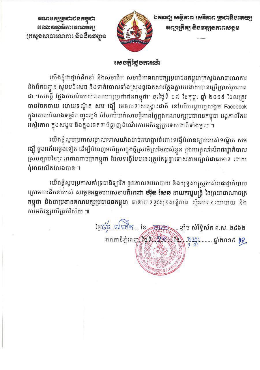 គណបក្សប្រជាជនកម្ពុជា ប្រចាំក្រសួងសាធារណការ ថ្កោលទោសទណ្ឌិត សម រង្ស៉ី ដែលចែកចាយលិខិតក្លែងក្លាយ ញុះញង់ឲ្យមានសង្រ្គាម បំណងបំផ្លាញដល់ដំណើរការអភិវឌ្ឍជាតិ Posted on ថ្ងៃចន្ទ, 11 ខែកុម្ភៈ, 2019ថ្ងៃចន្ទ, 11 ខែកុម្ភៈ, 2019
