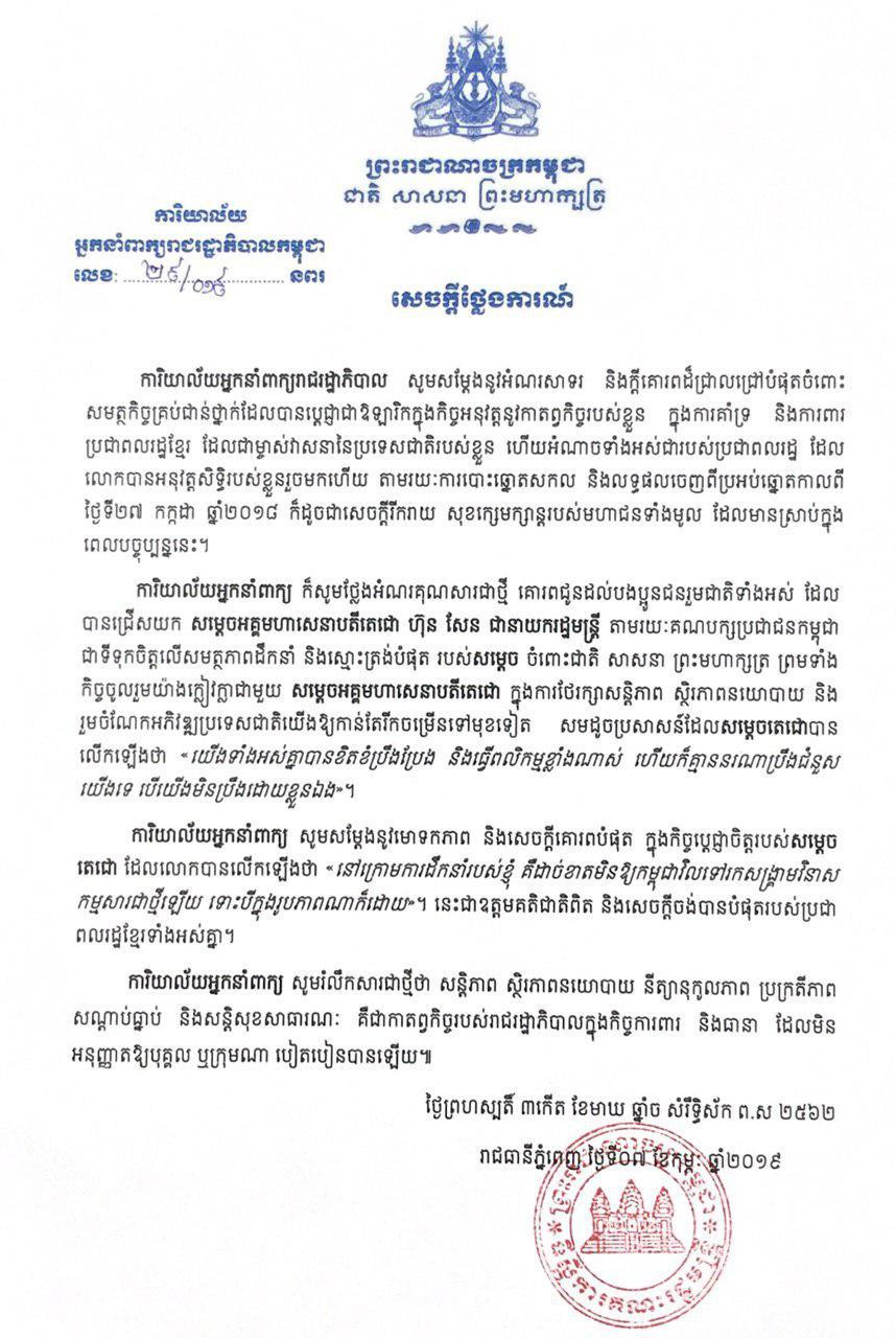 អ្នកនាំពាក្យរាជរដ្ឋាភិបាល ចេញសេចក្តីថ្លែងការណ៍ គាំទ្រការប្តេជ្ញាចិត្តសម្តេចតេជោ ដែលធានាមិនឲ្យមានសង្គ្រាមជាថ្មី Posted on ថ្ងៃព្រហស្បតិ៍, 7 ខែកុម្ភៈ, 2019ថ្ងៃព្រហស្បតិ៍, 7 ខែកុម្ភៈ, 2019