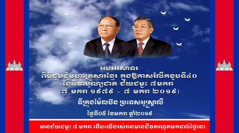 ពលរដ្ឋខ្មែរទីក្រុងម៉ែលប៊ន ប្រទេសអូស្ត្រាលីជាង៥០០នាក់ ជួបជុំអបអរសាទរខួបទី៤០ ថ្ងៃជ័យជម្នះ៧មករា Posted on ថ្ងៃអាទិត្យ, 6 ខែមករា, 2019ថ្ងៃអាទិត្យ, 6 ខែមករា, 2019