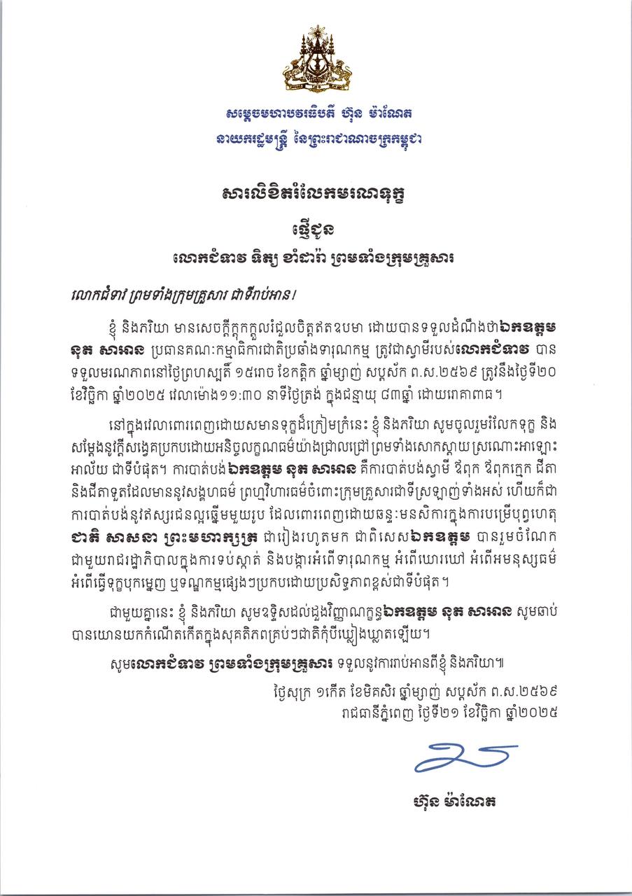សម្តេចបវរធិបតី ហ៊ុន ម៉ាណែត ផ្ញើសារលិខិតរំលែកមរណទុក្ខជូនលោកស្រី ទិត្យ ខាំដារ៉ា ព្រមទាំងក្រុមគ្រួសារ ចំពោះមរណភាពរបស់លោក នុត សាអាន ប្រធានគណៈកម្មាធិការជាតិប្រឆាំងទារុណកម្ម Posted on ថ្ងៃសុក្រ, 21 ខែវិច្ឆិកា, 2025ថ្ងៃសុក្រ, 21 ខែវិច្ឆិកា, 2025
