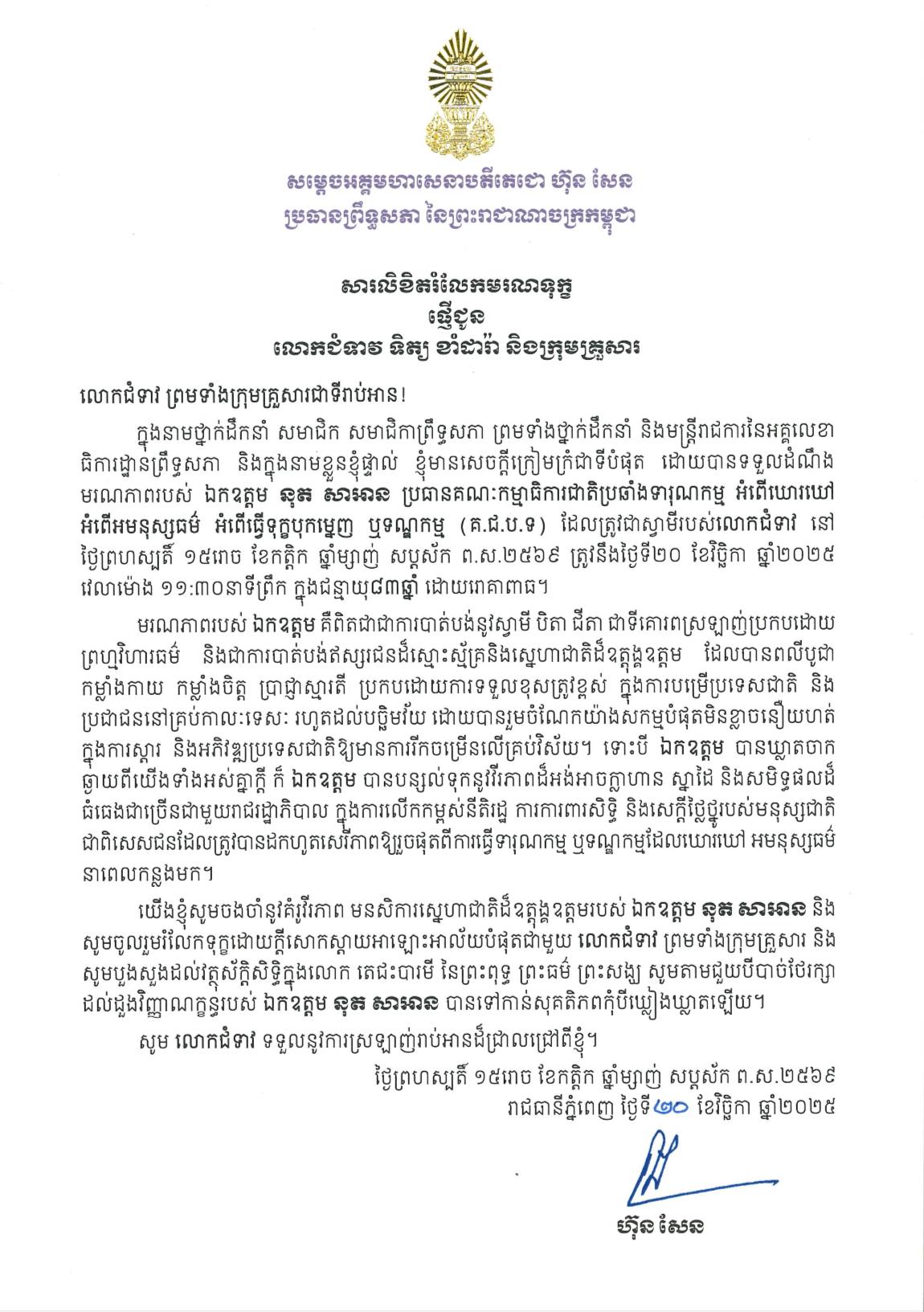សម្តេចតេជោ ហ៊ុន សែន ផ្ញើសារលិខិតរំលែកមរណទុក្ខផ្ញើជូនលោកស្រី ទិត្យ ខាំដារ៉ា ព្រមទាំងក្រុមគ្រួសារ ចំពោះមរណភាពរបស់លោក នុត សាអាន ប្រធានគណៈកម្មាធិការជាតិប្រឆាំងទារុណកម្ម Posted on ថ្ងៃសុក្រ, 21 ខែវិច្ឆិកា, 2025ថ្ងៃសុក្រ, 21 ខែវិច្ឆិកា, 2025