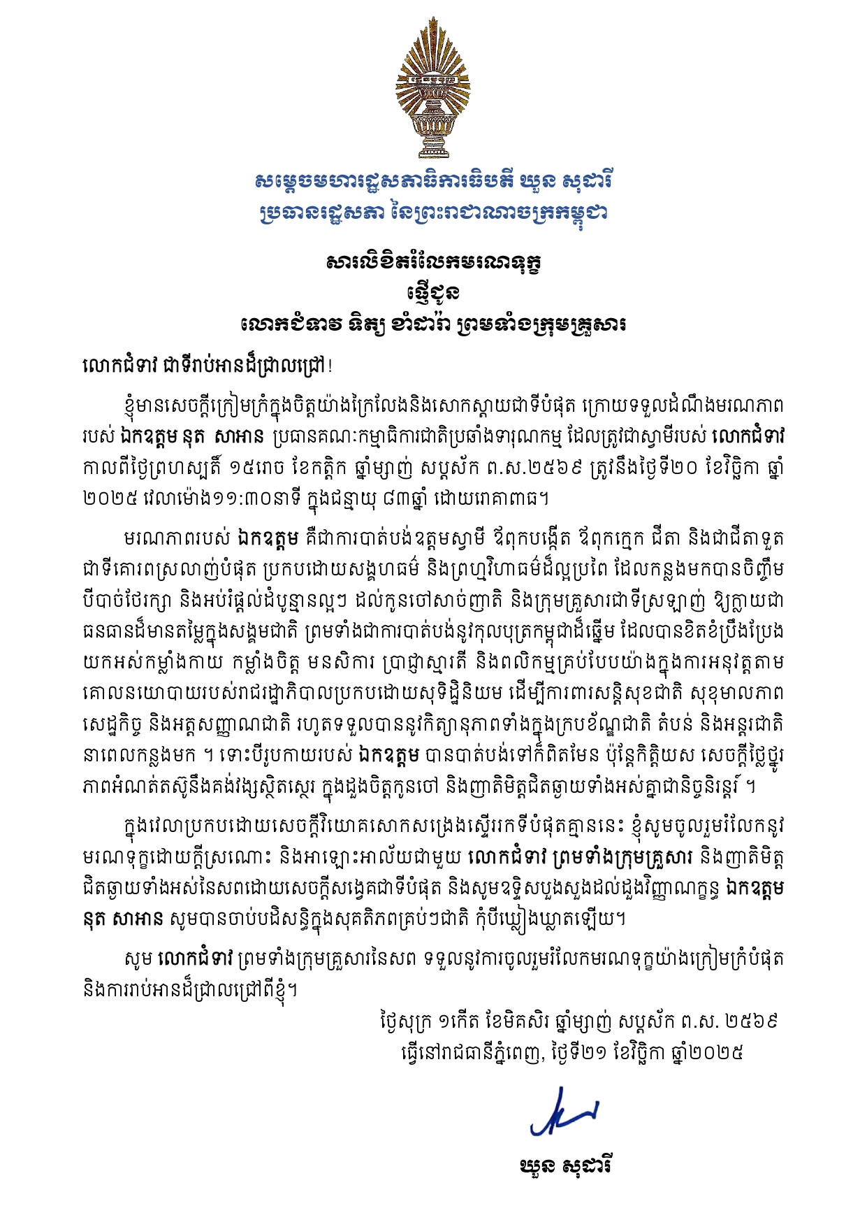 សម្តេចមហារដ្ឋសភាធិការធិបតី ឃួន សុដារី ផ្ញើសាររំលែកទុក្ខ ចំពោះមរណភាពរបស់ លោក នុត សាអាន ប្រធានគណៈកម្មាធិការជាតិប្រឆាំងទារុណកម្ម Posted on ថ្ងៃសុក្រ, 21 ខែវិច្ឆិកា, 2025ថ្ងៃសុក្រ, 21 ខែវិច្ឆិកា, 2025