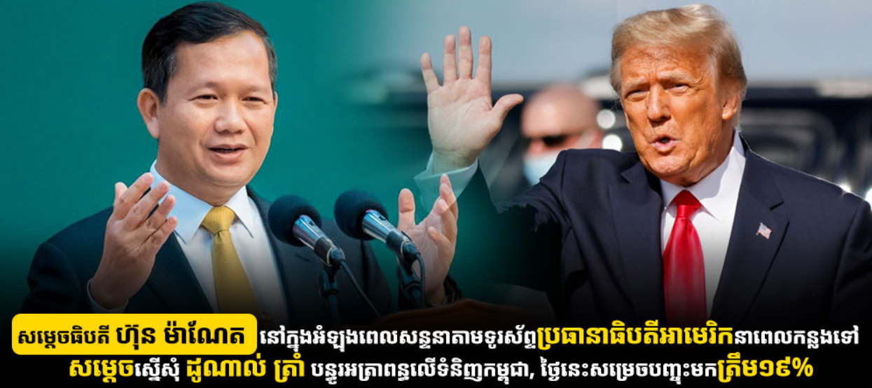 សម្តេចធិបតី ហ៊ុន ម៉ាណែត៖ នៅក្នុងអំឡុងពេលសន្ទនាតាមទូរស័ព្ទប្រធានាធិបតីអាមេរិកនាពេលកន្លងទៅ សម្តេចស្នើសុំ ដូណាល់ ត្រាំ បន្ធូរអត្រាពន្ធលើទំនិញកម្ពុជា, ថ្ងៃនេះសម្រេចបញ្ចុះមកត្រឹម១៩% Posted on ថ្ងៃសុក្រ, 1 ខែសីហា, 2025ថ្ងៃសុក្រ, 1 ខែសីហា, 2025