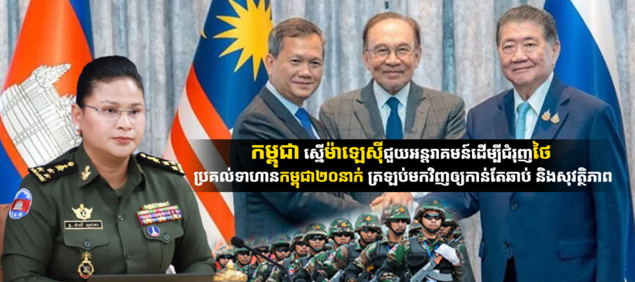 កម្ពុជា ស្នើម៉ាឡេស៉ីជួយអន្ដរាគមន៍ដើម្បីជំរុញថៃ ប្រគល់ទាហានកម្ពុជា២០នាក់ ត្រឡប់មកវិញឲ្យកាន់តែឆាប់ និងសុវត្ថិភាព Posted on ថ្ងៃសុក្រ, 1 ខែសីហា, 2025ថ្ងៃសុក្រ, 1 ខែសីហា, 2025