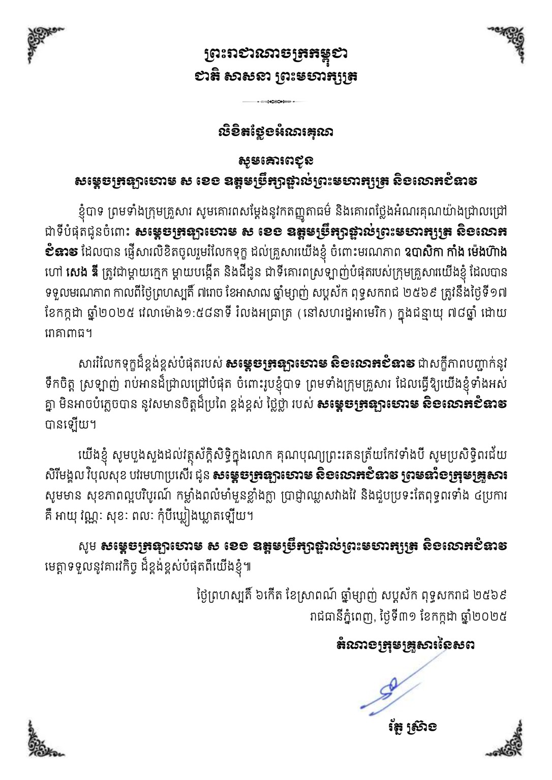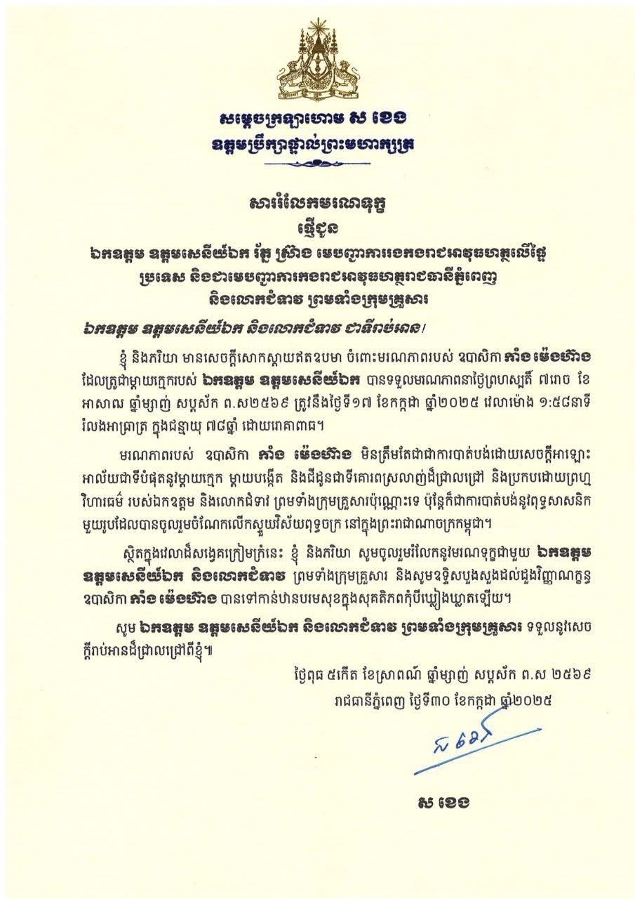 សម្ដេចក្រឡាហោម ស ខេង និងលោកជំទាវ ផ្ញើសាររំលែកទុក្ខជូន ឯកឧត្តម ឧត្តមសេនីយ៍ឯក រ័ត្ន ស្រ៊ាង ចំពោះមរណភាពរបស់ឧបាសិកា កាំង ម៉េងហ៊ាង Posted on ថ្ងៃសុក្រ, 1 ខែសីហា, 2025ថ្ងៃសុក្រ, 1 ខែសីហា, 2025