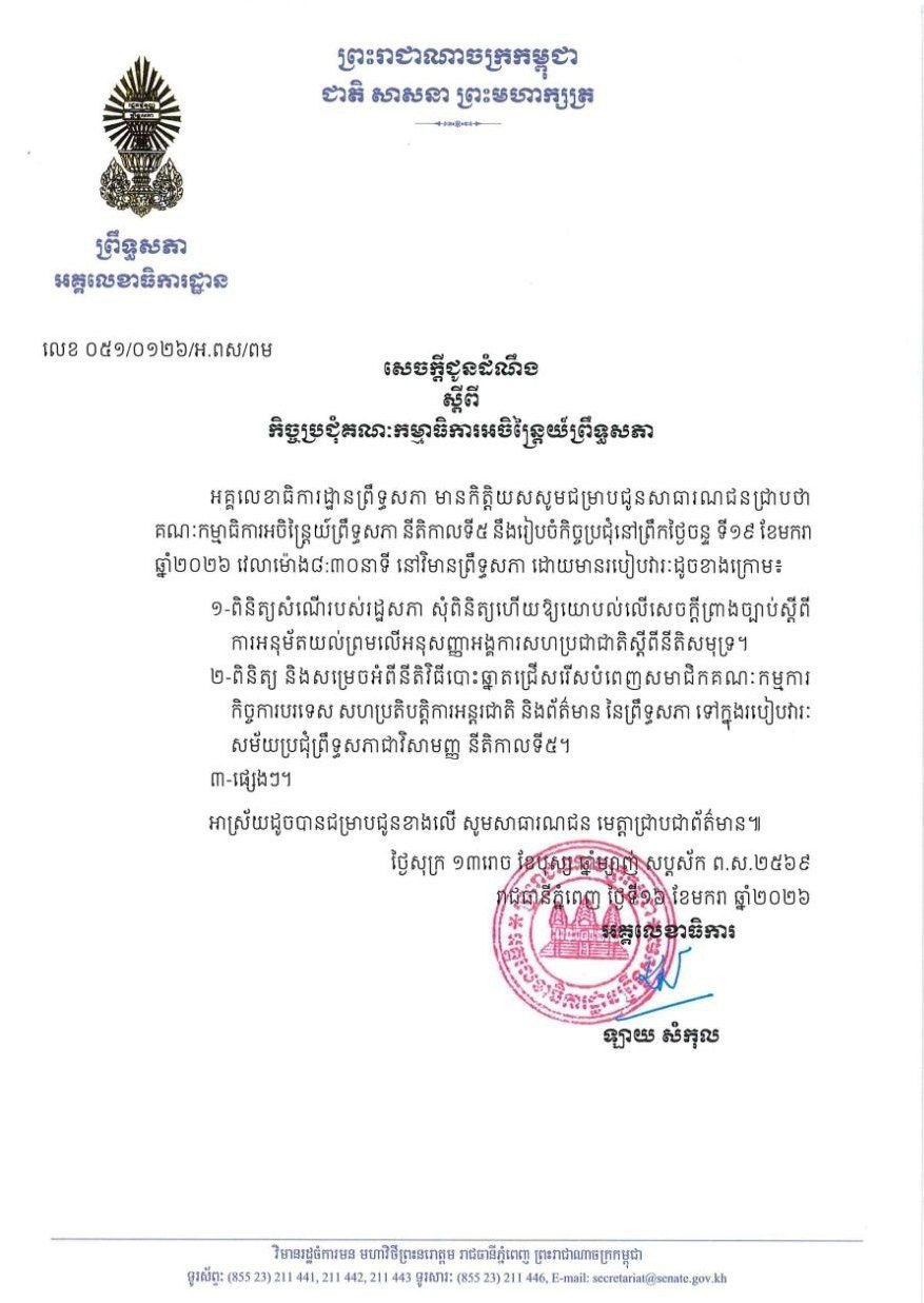 ព្រឹកស្អែក ព្រឹទ្ធសភា នឹងបើកកិច្ចប្រជុំគណៈកម្មាធិការអចិន្ត្រៃយ៍ នីតិកាលទី៥ Posted on ថ្ងៃអាទិត្យ, 18 ខែមករា, 2026ថ្ងៃអាទិត្យ, 18 ខែមករា, 2026