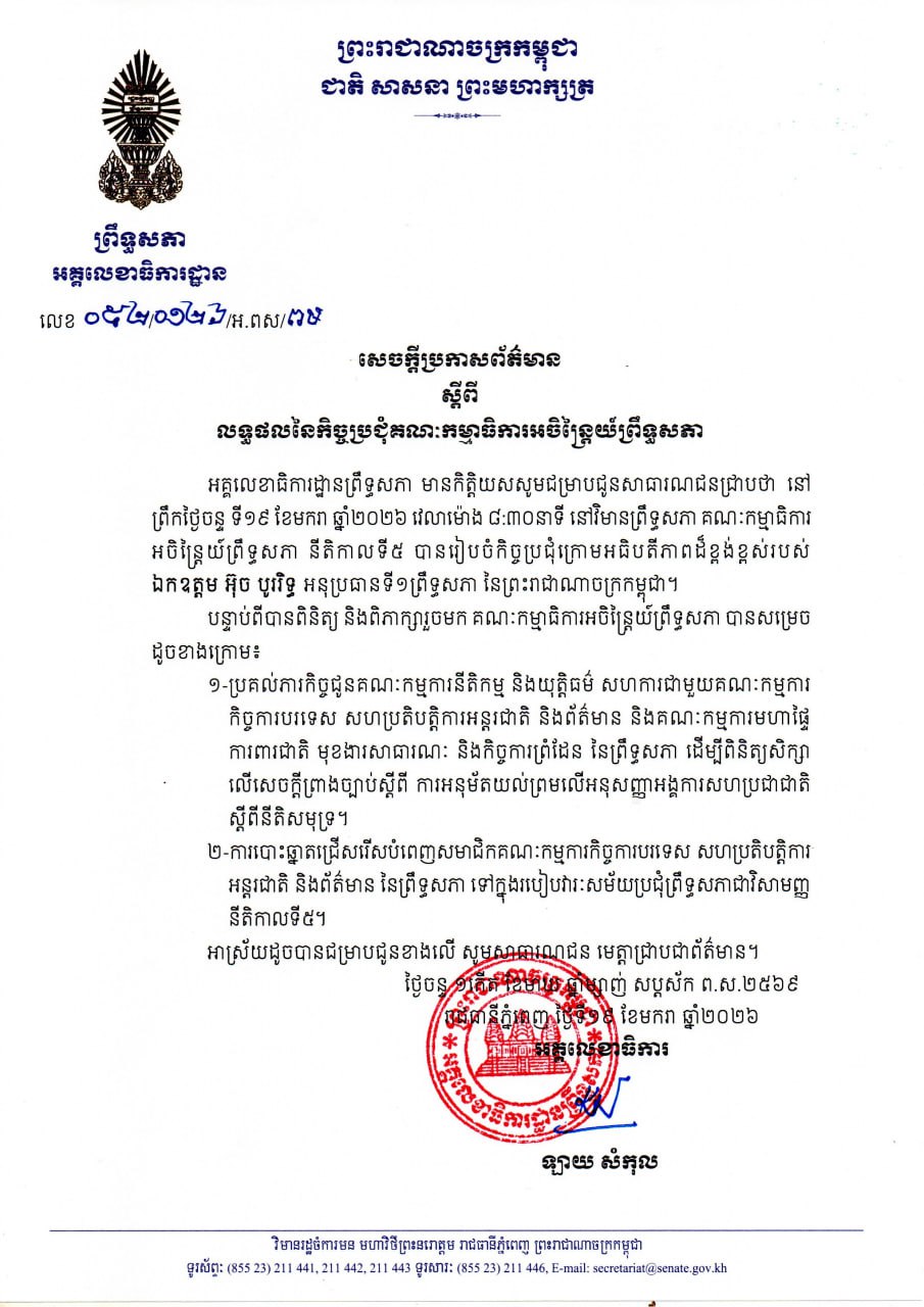 ព្រឹទ្ធសភា បង្ហាញលទ្ធផលនៃកិច្ចប្រជុំគណៈកម្មាធិការអចិន្ត្រៃយ៍ ដោយមានរបៀបវារៈចំនួន២ Posted on ថ្ងៃចន្ទ, 19 ខែមករា, 2026ថ្ងៃចន្ទ, 19 ខែមករា, 2026