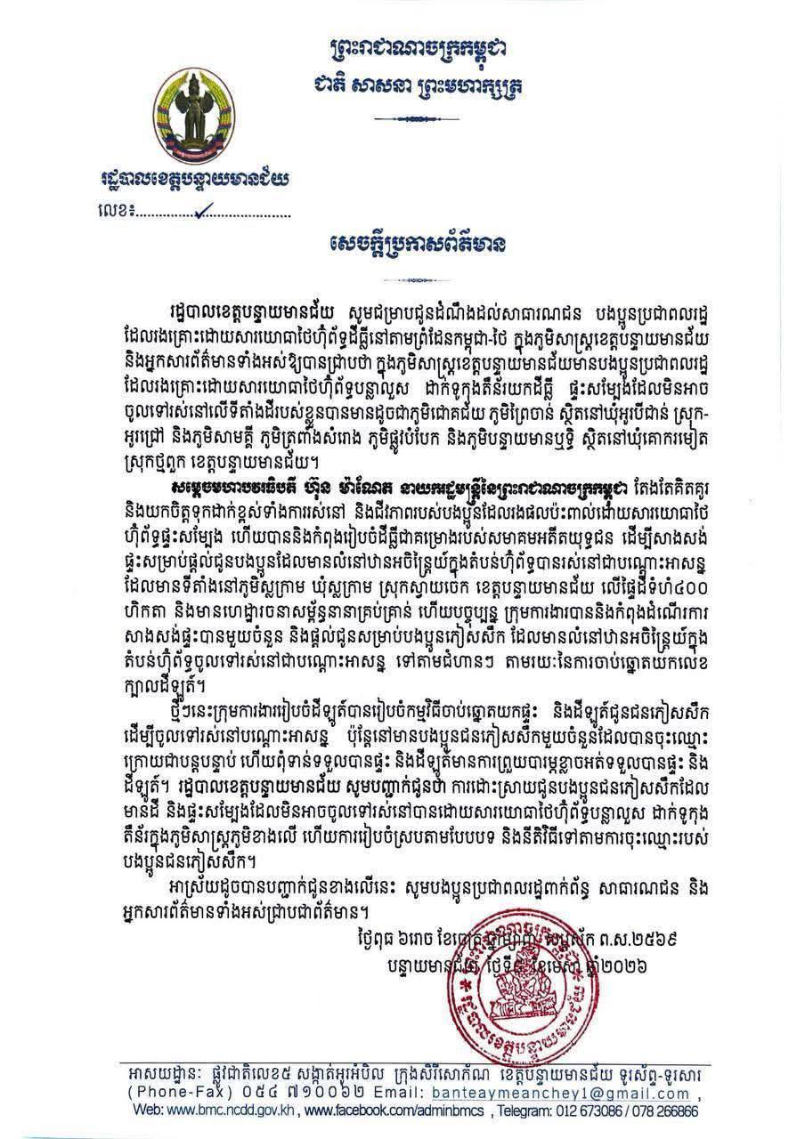 រដ្ឋបាលខេត្តបន្ទាយមានជ័យ៖ ក្រុមការងារកំពុងដំណើរការសាងសង់ផ្ទះបណ្តោះអាសន្នជូនបងប្អូនភៀសសឹក ដែលត្រូវទាហានចូលឈ្លានពាន និងកាន់កាប់ផ្ទះសម្បែង Posted on ថ្ងៃព្រហស្បតិ៍, 9 ខែមេសា, 2026ថ្ងៃព្រហស្បតិ៍, 9 ខែមេសា, 2026