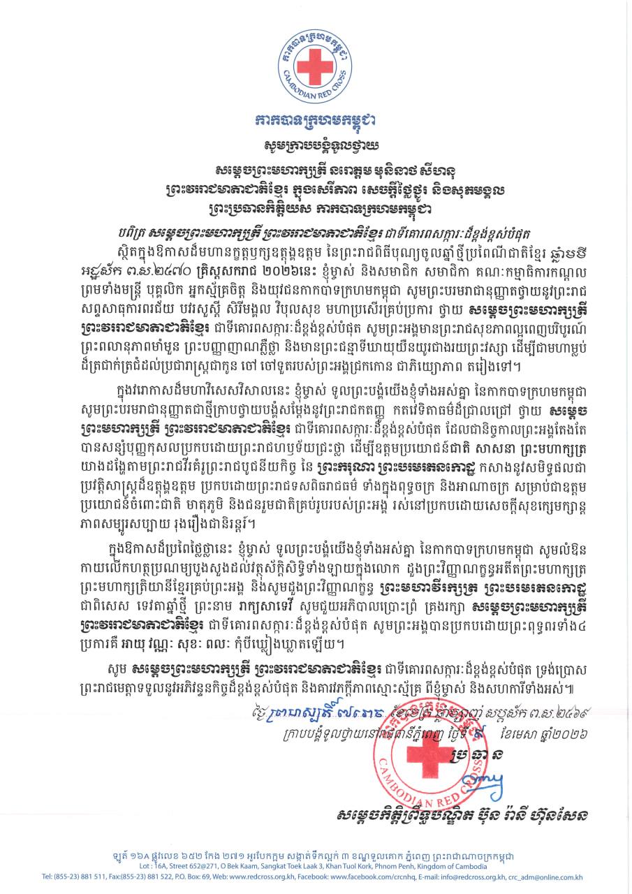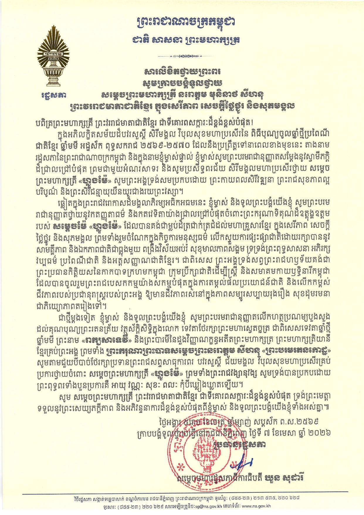 សម្តេចរដ្ឋសភាធិបតី ឃួន សុដារី ផ្ញើសារថ្វាយព្រះពរ សម្តេចព្រះមហាក្សត្រី នរោត្តម មុនិនាថ សីហនុ ក្នុងឱកាសបុណ្យចូលឆ្នាំថ្មី ឆ្នាំមមី Posted on ថ្ងៃអាទិត្យ, 12 ខែមេសា, 2026ថ្ងៃអាទិត្យ, 12 ខែមេសា, 2026
