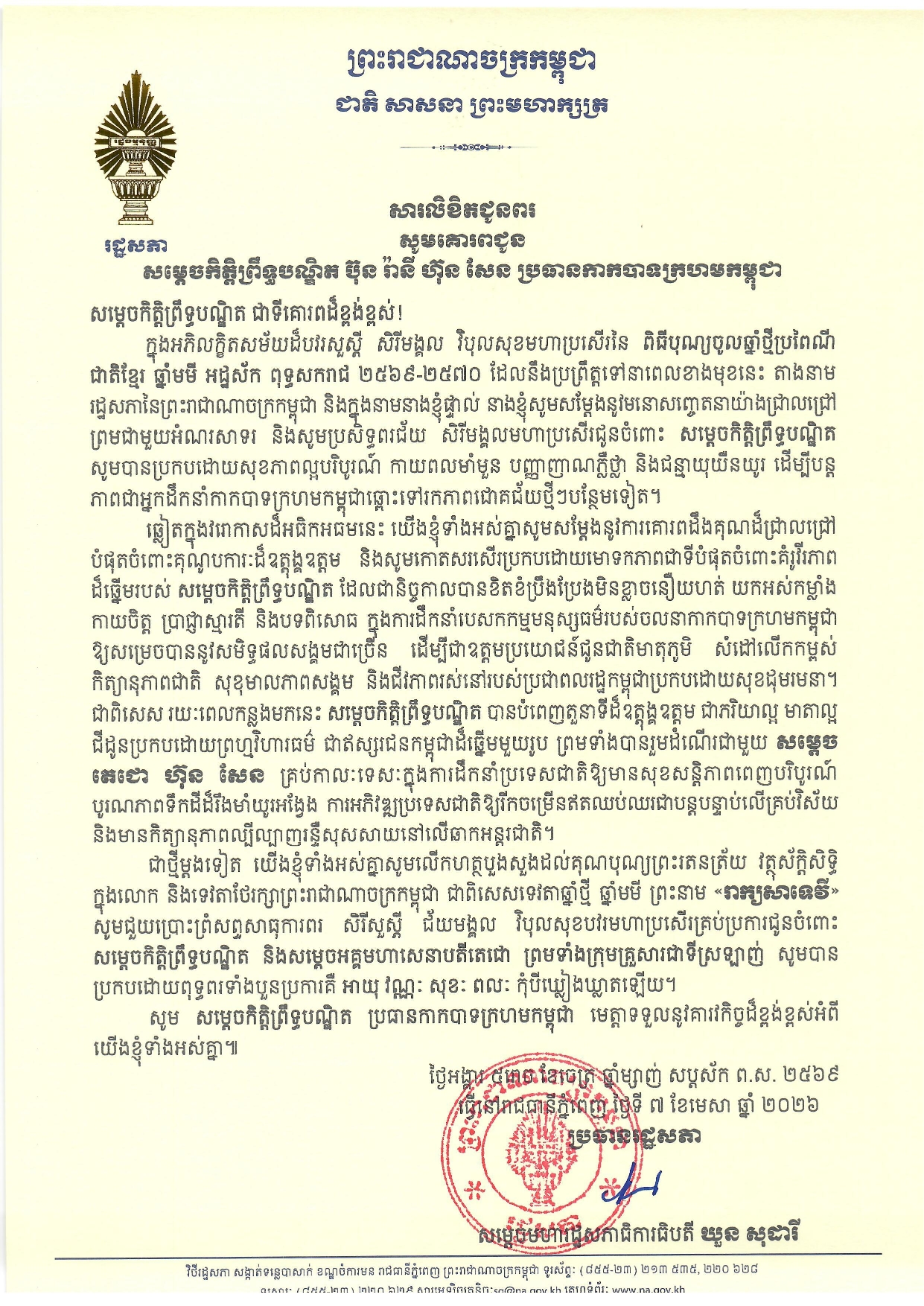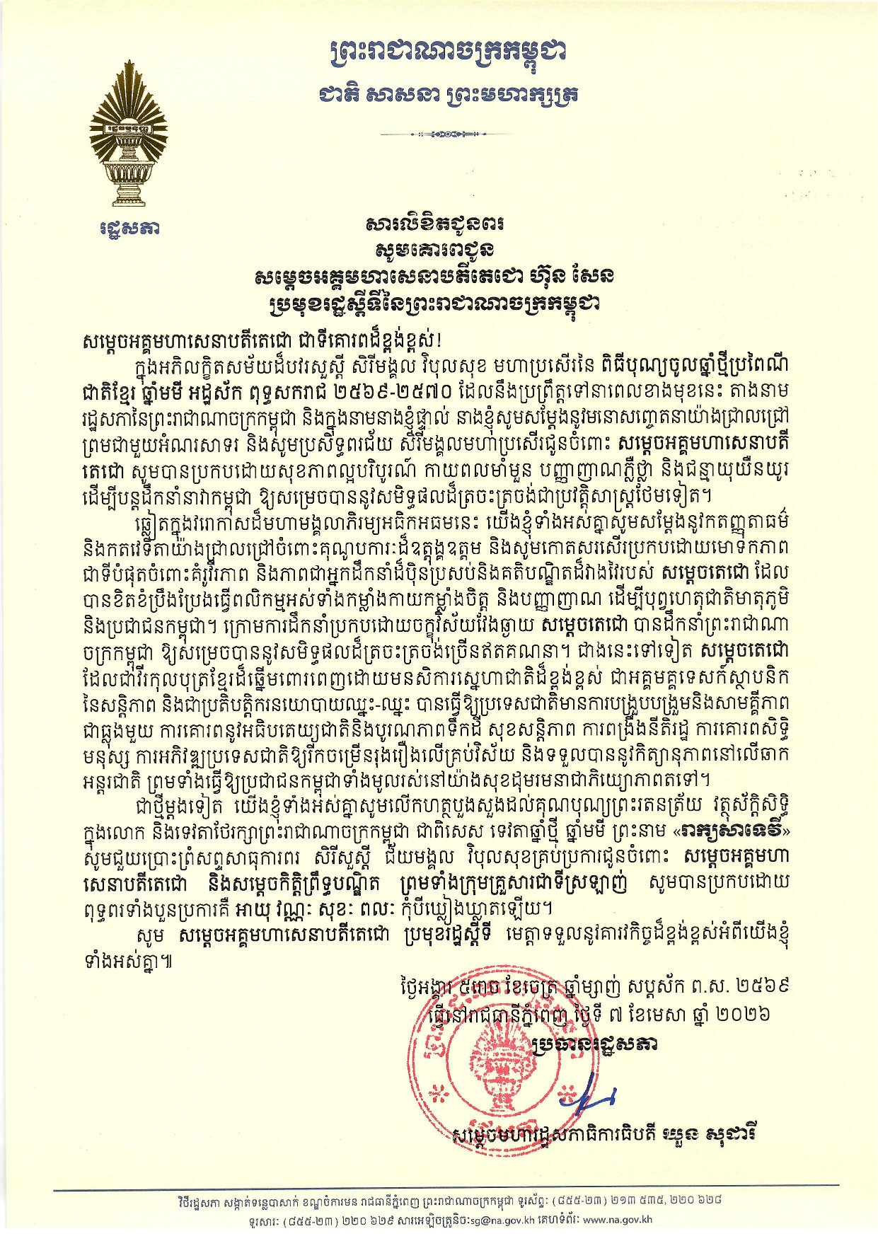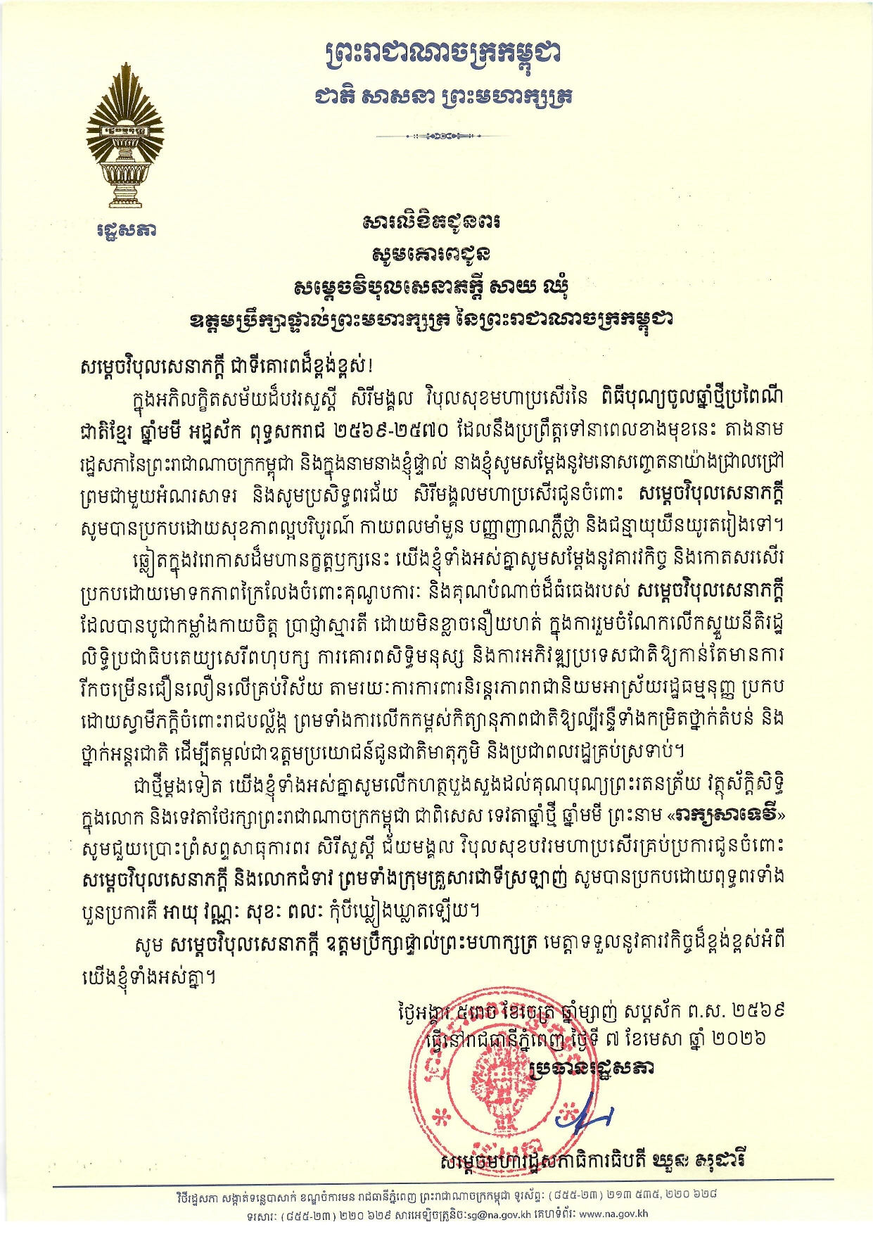សម្តេចរដ្ឋសភាធិបតី ឃួន សុដារី ផ្ញើសារលិខិតគោរពជូនពរ សម្តេចអគ្គមហាពញាចក្រី ហេង សំរិន ក្នុងឱកាសបុណ្យចូលឆ្នាំថ្មី ឆ្នាំមមី Posted on ថ្ងៃអាទិត្យ, 12 ខែមេសា, 2026ថ្ងៃអាទិត្យ, 12 ខែមេសា, 2026