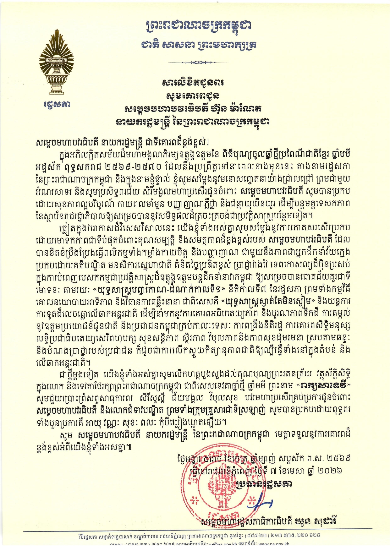 សម្តេចរដ្ឋសភាធិបតី ឃួន សុដារី ផ្ញើសារលិខិតគោរពជូនពរ សម្តេចមហាបវរធិបតី ហ៊ុន ម៉ាណែត ក្នុងឱកាសបុណ្យចូលឆ្នាំថ្មី ឆ្នាំមមី Posted on ថ្ងៃអាទិត្យ, 12 ខែមេសា, 2026ថ្ងៃអាទិត្យ, 12 ខែមេសា, 2026