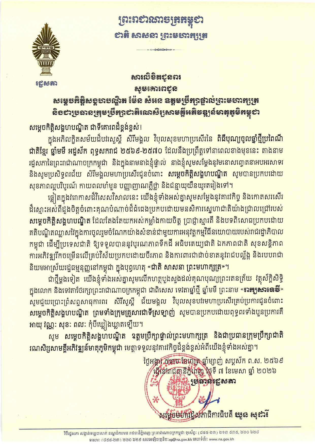 សម្តេចរដ្ឋសភាធិបតី ឃួន សុដារី ផ្ញើសារលិខិតគោរពជូនពរ សម្តេចកិត្តិសង្គហបណ្ឌិត ម៉ែន សំអន ក្នុងឱកាសបុណ្យចូលឆ្នាំថ្មី ឆ្នាំមមី Posted on ថ្ងៃអាទិត្យ, 12 ខែមេសា, 2026ថ្ងៃអាទិត្យ, 12 ខែមេសា, 2026