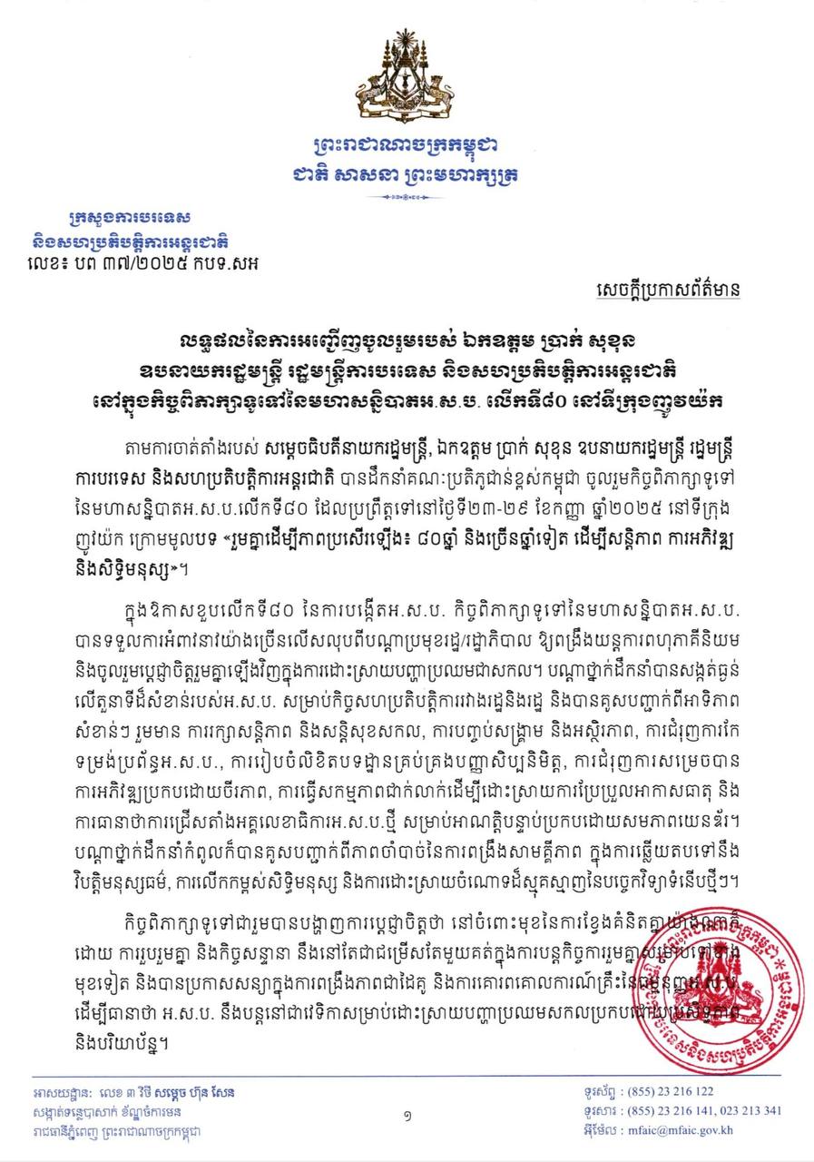 ប្រមុខការទូតកម្ពុជា ប្រាប់មហាសន្និបាត និងអគ្គលេខាធិការអង្គការសហប្រជាជាតិ អំពីការវាយប្រហារឥតញញើតរំលោភអធិបតេយ្យរបស់កម្ពុជាពីសំណាក់ប្រទេសថៃ និងអំពាវនាវអន្ដរជាតិបន្ដតាមដាន និងអន្តរាគមន៍ Posted on ថ្ងៃអង្គារ, 30 ខែកញ្ញា, 2025ថ្ងៃអង្គារ, 30 ខែកញ្ញា, 2025