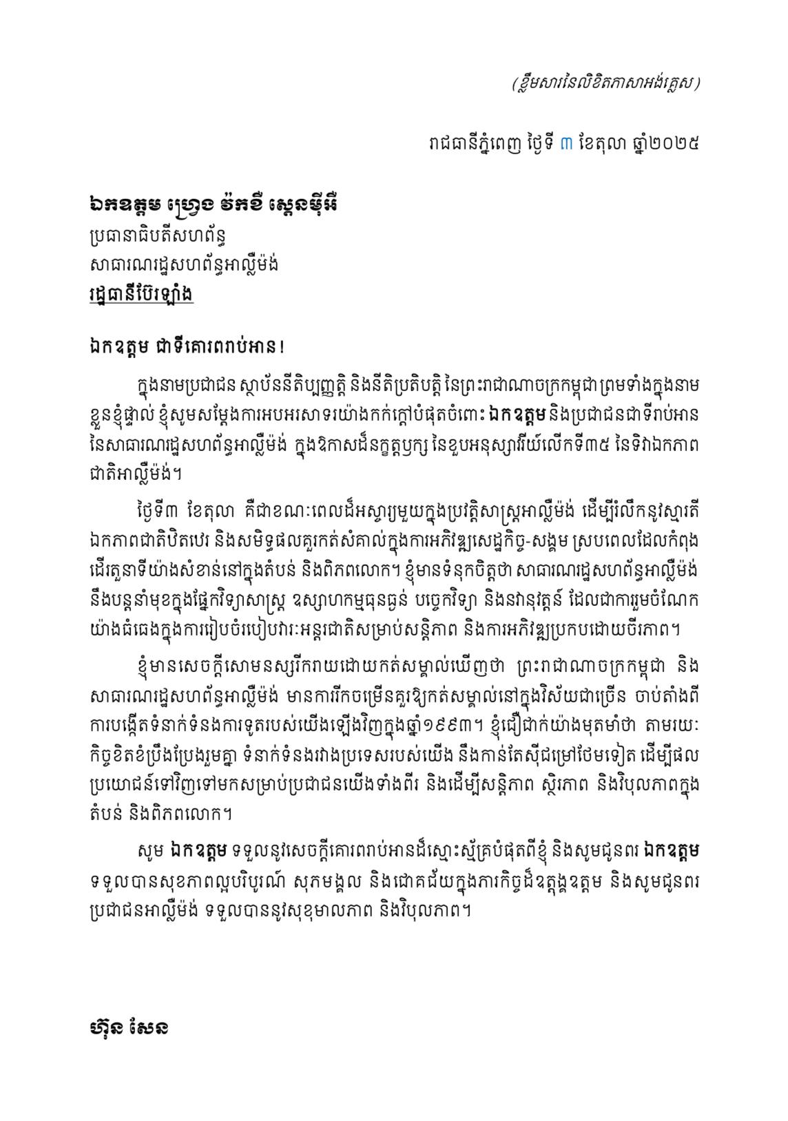 សម្តេចតេជោ ហ៊ុន សែន ប្រមុខរដ្ឋស្តីទី ផ្ញើសារលិខិតជូនប្រធានាធិបតីអាល្លឺម៉ង់ អបអរសាទរក្នុងឱកាសខួបអនុស្សាវរីយ៍លើកទី៣៥ នៃទិវាឯកភាពជាតិអាល្លឺម៉ង់ Posted on ថ្ងៃសៅរ៍, 4 ខែតុលា, 2025ថ្ងៃសៅរ៍, 4 ខែតុលា, 2025