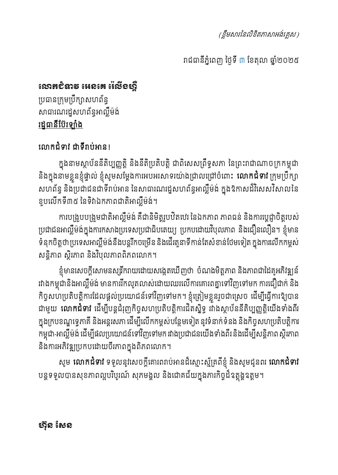 សម្តេចតេជោ ហ៊ុន សែន ប្រមុខរដ្ឋស្តីទី ផ្ញើសារលិខិតជូនប្រធានក្រុមប្រឹក្សាសហព័ន្ធ សាធារណរដ្ឋសហព័ន្ធអាល្លឺម៉ង់ អបអរសាទរក្នុងឱកាសខួបអនុស្សាវរីយ៍លើកទី៣៥ នៃទិវាឯកភាពជាតិអាល្លឺម៉ង់ Posted on ថ្ងៃសៅរ៍, 4 ខែតុលា, 2025ថ្ងៃសៅរ៍, 4 ខែតុលា, 2025