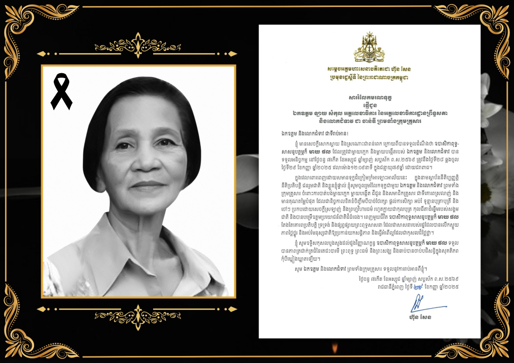 សម្តេចកិត្តិព្រឹទ្ធបណ្ឌិត ប៊ុន រ៉ានី ហ៊ុនសែន ផ្ញើសារលិខិតរំលែកទុក្ខជូនឯកឧត្តម ឡាយ សំកុល និងលោកជំទាវ ចំពោះមរណភាព ឧបាសិកាពុទ្ធសាសនូបត្ថម្ភក៍ មាឃ ផល Posted on ថ្ងៃចន្ទ, 29 ខែកញ្ញា, 2025ថ្ងៃចន្ទ, 29 ខែកញ្ញា, 2025
