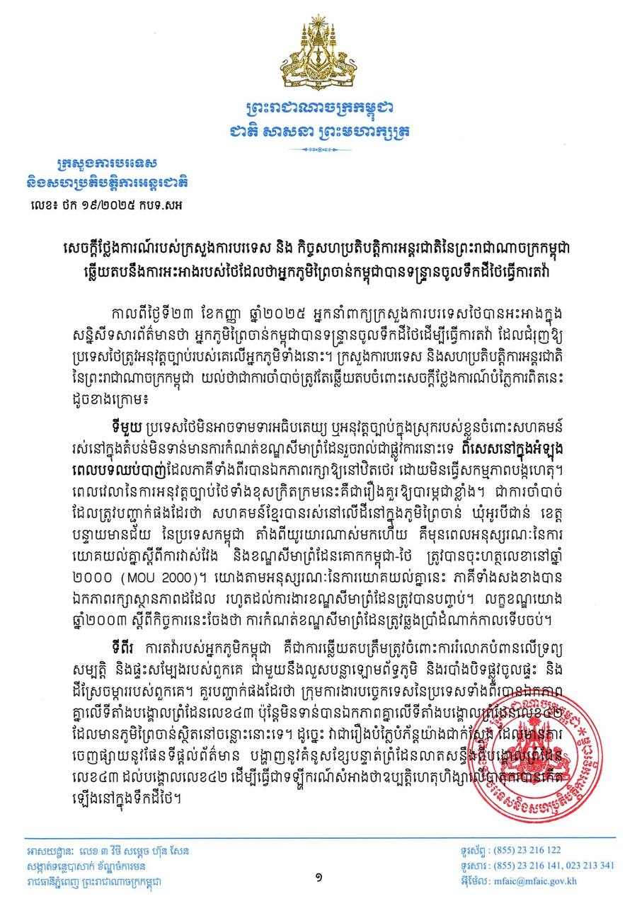 ក្រសួងការបរទេសកម្ពុជា ចេញសេចក្តីថ្លែងការណ៍ ឆ្លើយតបនឹងការអះអាងរបស់ថៃ ដែលថាអ្នកភូមិព្រៃចាន់កម្ពុជា បានទន្ទ្រានចូលទឹកដីថៃធ្វើការតវ៉ា Posted on ថ្ងៃពុធ, 24 ខែកញ្ញា, 2025ថ្ងៃពុធ, 24 ខែកញ្ញា, 2025