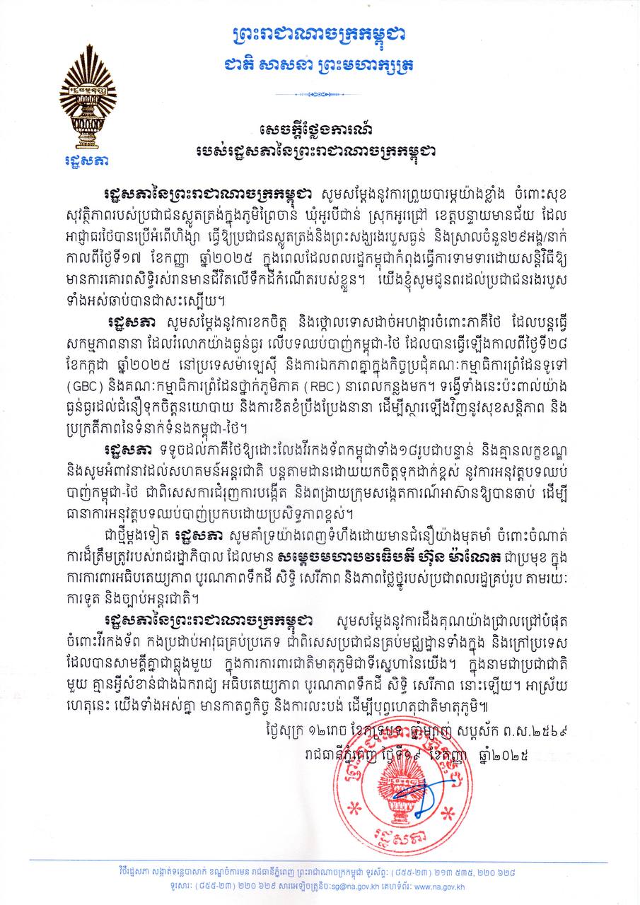 រដ្ឋសភាកម្ពុជា ថ្កោលទោសដាច់អហង្ការចំពោះភាគីថៃ ដែលប្រើអំពើហិង្សា ធ្វើឱ្យប្រជាជនស្លូតត្រង់និងព្រះសង្ឃរងរបួសធ្ងន់ និងស្រាលចំនួន២៩អង្គ/នាក់ Posted on ថ្ងៃសុក្រ, 19 ខែកញ្ញា, 2025ថ្ងៃសុក្រ, 19 ខែកញ្ញា, 2025