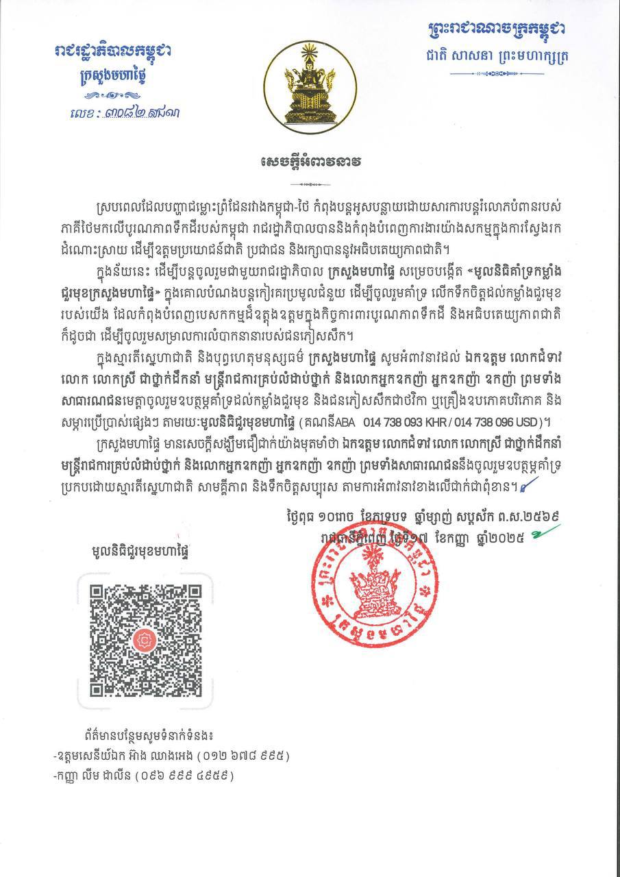 ក្រសួងមហាផ្ទៃ បង្កើត «មូលនិធិគាំទ្រកម្លាំង ជួរមុខក្រសួងមហាផ្ទៃ» ដើម្បីគាំទ្រ និងលើកទឹកចិត្តកម្លាំងជួរមុខ Posted on ថ្ងៃសុក្រ, 19 ខែកញ្ញា, 2025ថ្ងៃសុក្រ, 19 ខែកញ្ញា, 2025