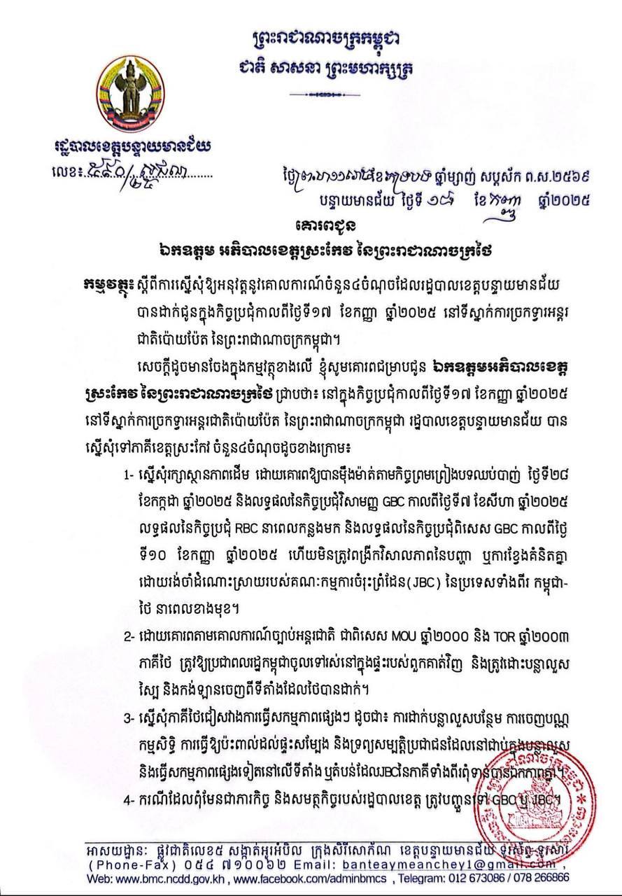 អភិបាលខេត្តបន្ទាយមានជ័យ ផ្ញើលិខិតទៅ អភិបាលខេត្តស្រះកែវរបស់ថៃ ស្តីពីការស្នើសុំឱ្យអនុវត្តនូវគោលការណ៍៤ ចំណុចដែលរដ្ឋបាលខេត្តបន្ទាយមានជ័យបានដាក់ជូនក្នុងកិច្ចប្រជុំកាលពីថ្ងៃទី១៧ ខែកញ្ញា ឆ្នាំ២០២៥ Posted on ថ្ងៃសុក្រ, 19 ខែកញ្ញា, 2025ថ្ងៃសុក្រ, 19 ខែកញ្ញា, 2025