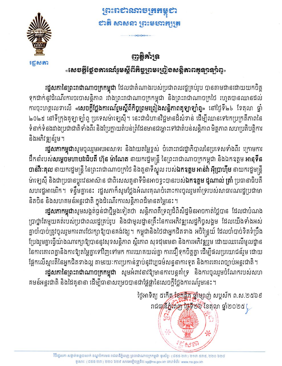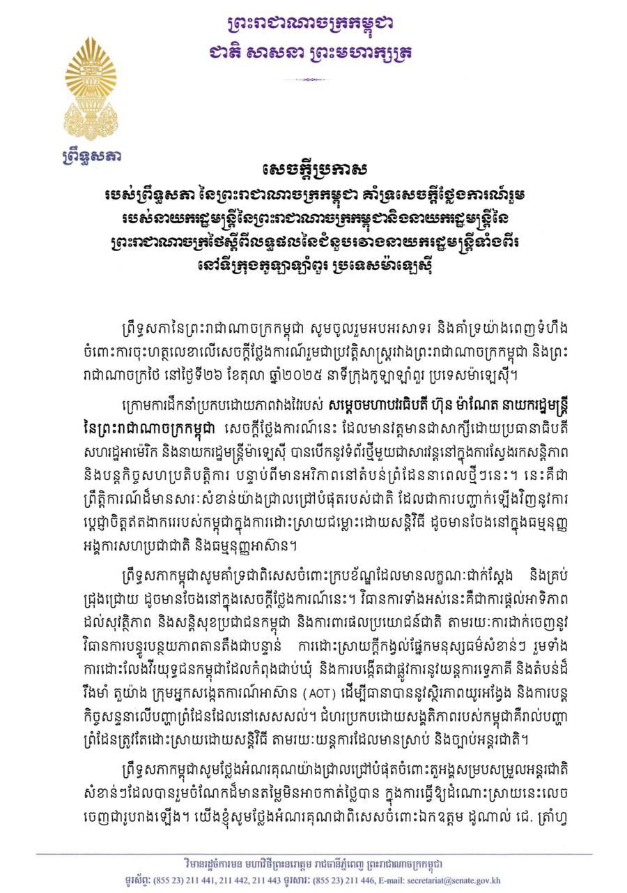 ព្រឹទ្ធសភា ចេញប្រកាសគាំទ្រកិច្ចព្រមព្រៀងសន្តិភាពកម្ពុជា-ថៃ ដែលចុះហត្ថលេខាដោយនាយករដ្ឋមន្រ្តីប្រទេសទាំងពីរ នៅទីក្រុងកូឡាឡាំពួ ដោយមានប្រធានាធិបតី ដូណាល់ ត្រាំ និងនាយករដ្ឋមន្ត្រីម៉ាឡេស៊ី ជាសាក្សី Posted on ថ្ងៃចន្ទ, 27 ខែតុលា, 2025ថ្ងៃចន្ទ, 27 ខែតុលា, 2025