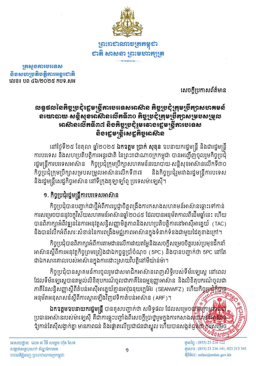 លទ្ធផលកិច្ចប្រជុំរដ្ឋមន្រ្តីការបរទេសអាស៊ាន កិច្ចប្រជុំក្រុមប្រឹក្សាសហគមន៍នយោបាយ-សន្តិសុខអាស៊ានលើកទី៣០ កិច្ចប្រជុំក្រុមប្រឹក្សាសម្របសម្រួលអាស៊ាន លើកទី៣៧ និងកិច្ចប្រជុំរួមរវាងរដ្ឋមន្រ្តីការបទេស និងរដ្ឋមន្រ្តីសេដ្ឋកិច្ចអាស៊ាន Posted on ថ្ងៃចន្ទ, 27 ខែតុលា, 2025ថ្ងៃចន្ទ, 27 ខែតុលា, 2025