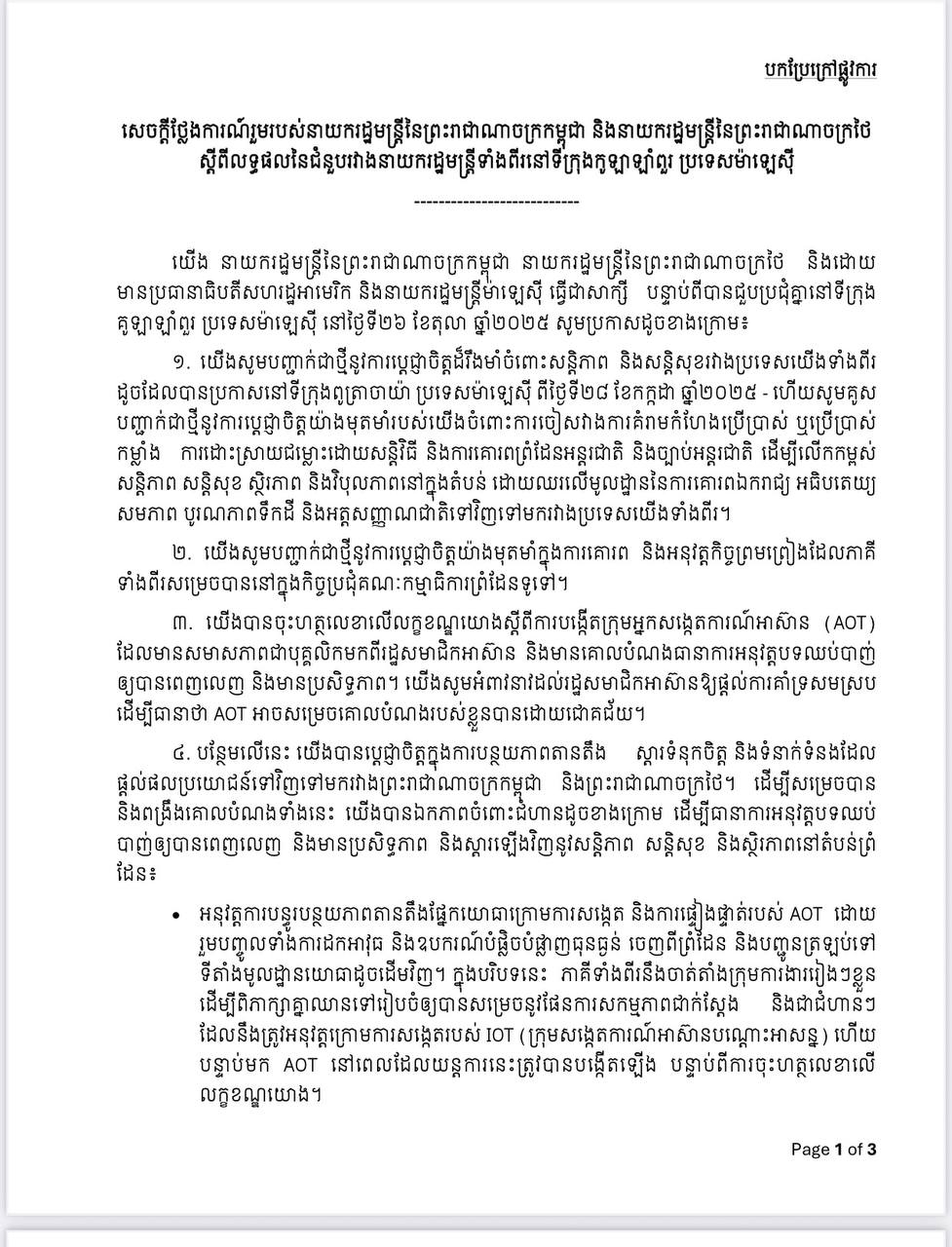 សេចក្តីថ្លែងការណ៍រួមរបស់នាយករដ្ឋមន្ត្រីកម្ពុជា និងនាយករដ្ឋមន្ត្រីថៃ ស្តីពីលទ្ធផលនៃជំនួបរវាងនាយករដ្ឋមន្រ្តីទាំងពីរនៅទីក្រុងកូឡាឡាំពួរ ប្រទេសម៉ាឡេស៊ី Posted on ថ្ងៃចន្ទ, 27 ខែតុលា, 2025ថ្ងៃចន្ទ, 27 ខែតុលា, 2025