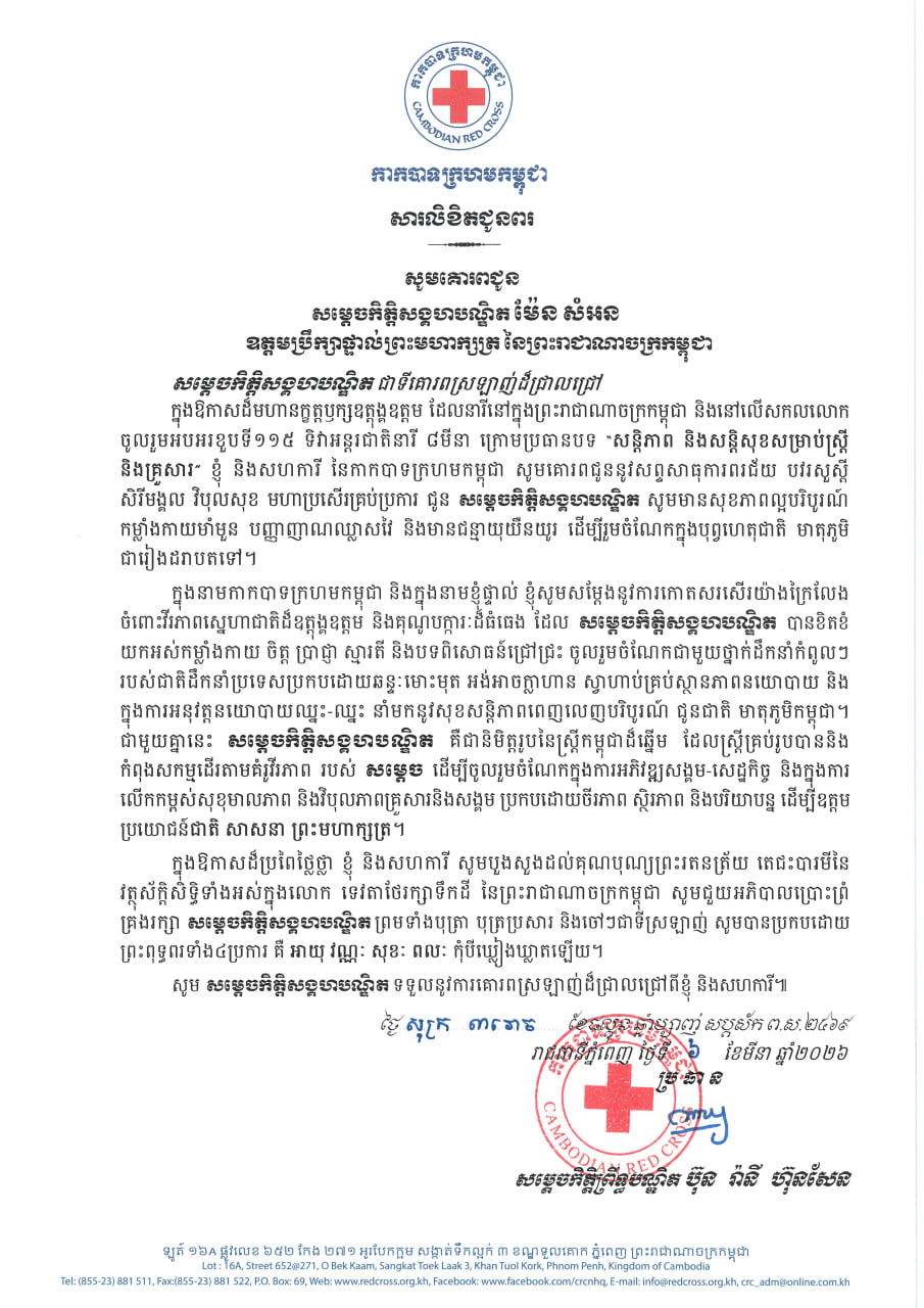 សម្តេចកិត្តិព្រឹទ្ធបណ្ឌិត ប៊ុន រ៉ានី ផ្ញើសារលិខិតជូនពរសម្តេចកិត្តិសង្គហបណ្ឌិត ម៉ែន សំអន ឧត្តមប្រឹក្សាផ្ទាល់ព្រះមហាក្សត្រ ក្នុងឱកាសខួបទី ១១៥ ទិវាអន្តរជាតិនារី ៨ មីនា Posted on ថ្ងៃសៅរ៍, 7 ខែមីនា, 2026ថ្ងៃសៅរ៍, 7 ខែមីនា, 2026