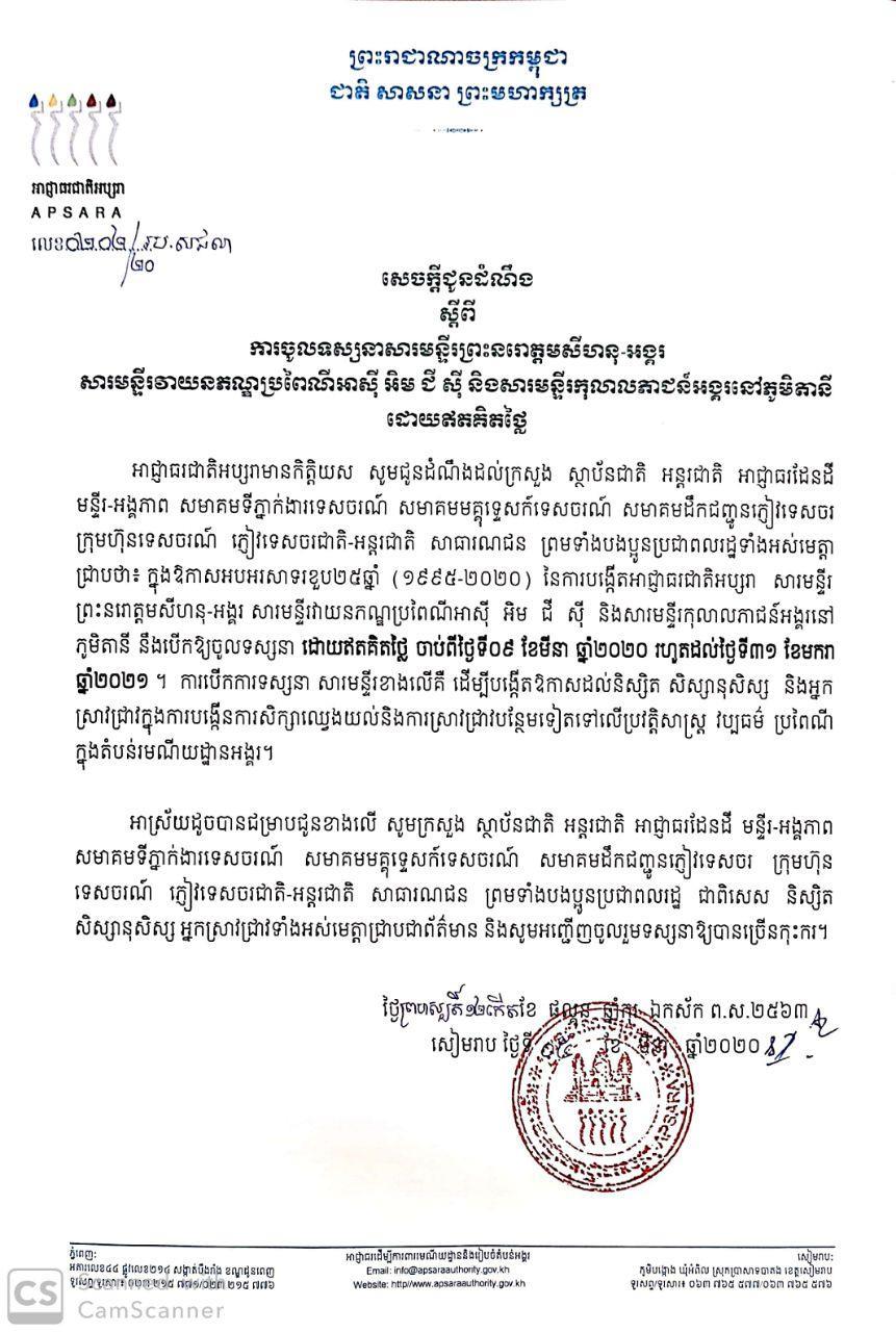 អាជ្ញាធរជាតិអប្សរាប្រកាសឱ្យភ្ញៀវជាតិ-អន្តរជាតិចូលទស្សនាសារមន្ទីរចំនួនបីដោយឥតគិតថ្លៃពេញមួយឆ្នាំ Posted on ថ្ងៃសុក្រ, 6 ខែមីនា, 2020ថ្ងៃសុក្រ, 6 ខែមីនា, 2020