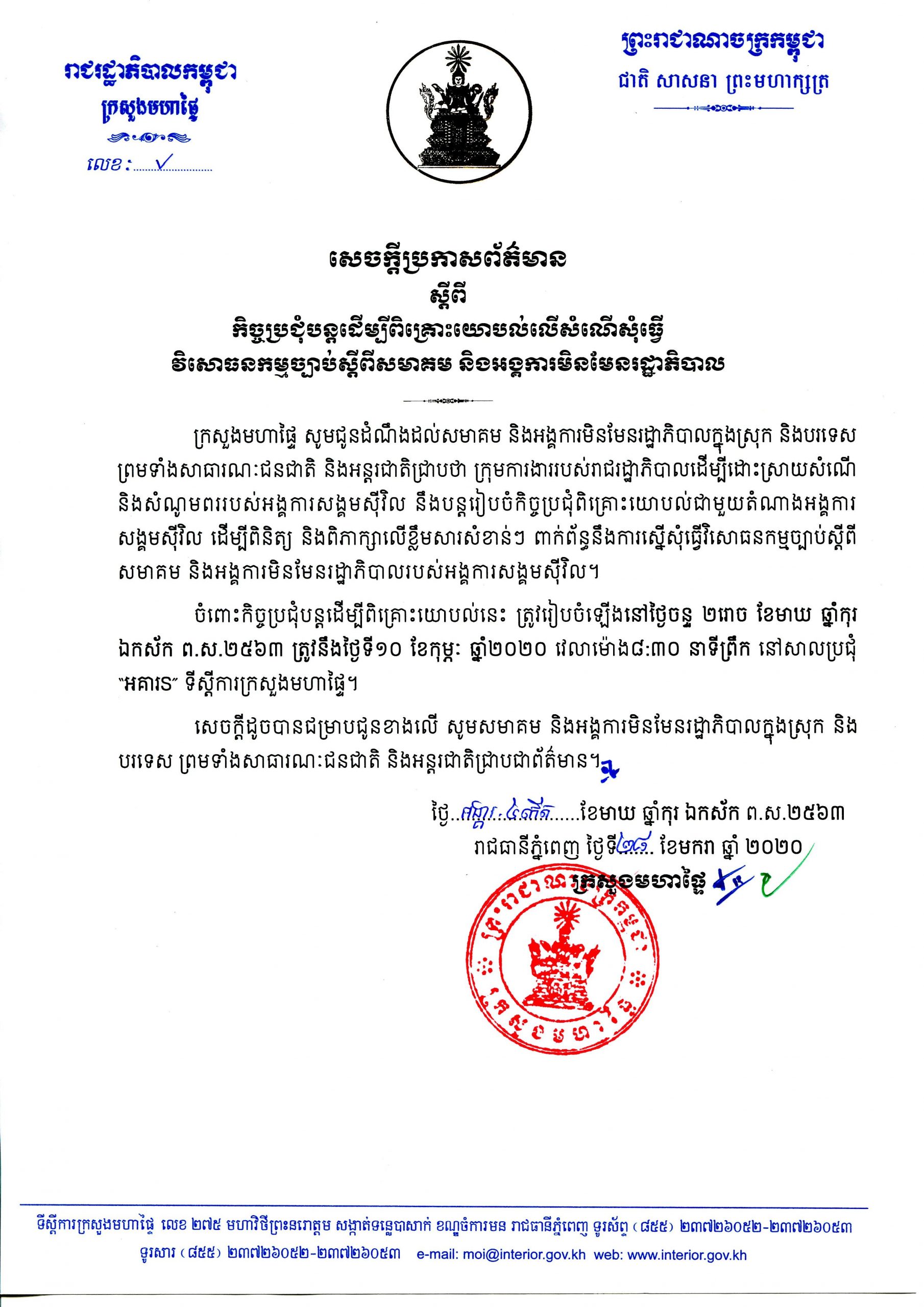 ក្រសួងមហាផ្ទៃ នឹងបន្តពិគ្រោះយោបល់លើសំណើសុំធ្វើវិសោធនកម្មច្បាប់ ស្តីពី «សមាគម និងអង្គការសង្គមស៊ីវិល មិនមែនរាជរដ្ឋាភិបាល» នៅខែកុម្ភៈ Posted on ថ្ងៃអង្គារ, 28 ខែមករា, 2020ថ្ងៃអង្គារ, 28 ខែមករា, 2020
