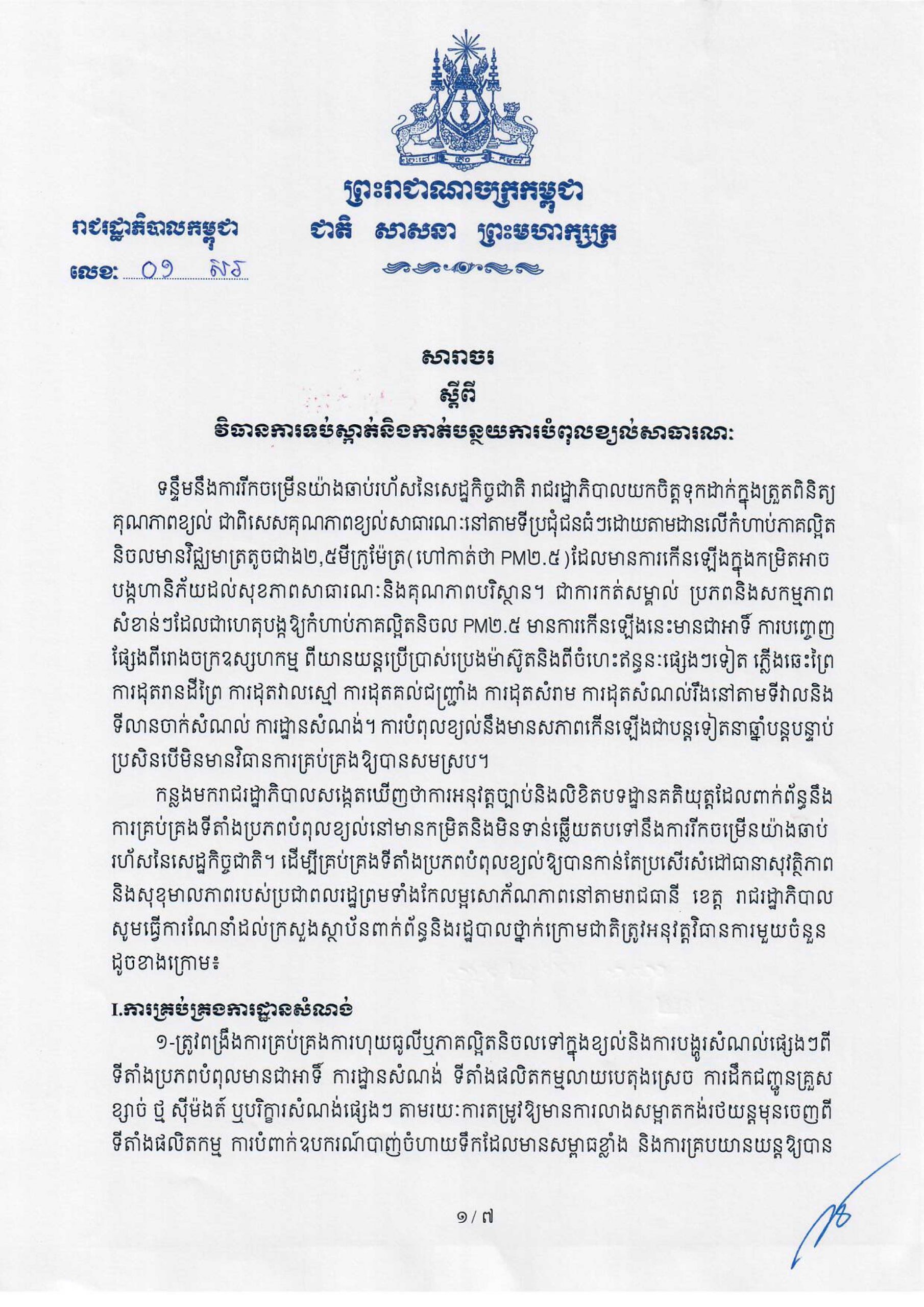 រាជរដ្ឋាភិបាល ចេញសារាចរស្តីពីវិធានការទប់ស្កាត់ និងកាត់បន្ថយការបំពុលខ្យល់សាធារណៈ Posted on ថ្ងៃព្រហស្បតិ៍, 2 ខែមករា, 2020ថ្ងៃព្រហស្បតិ៍, 2 ខែមករា, 2020