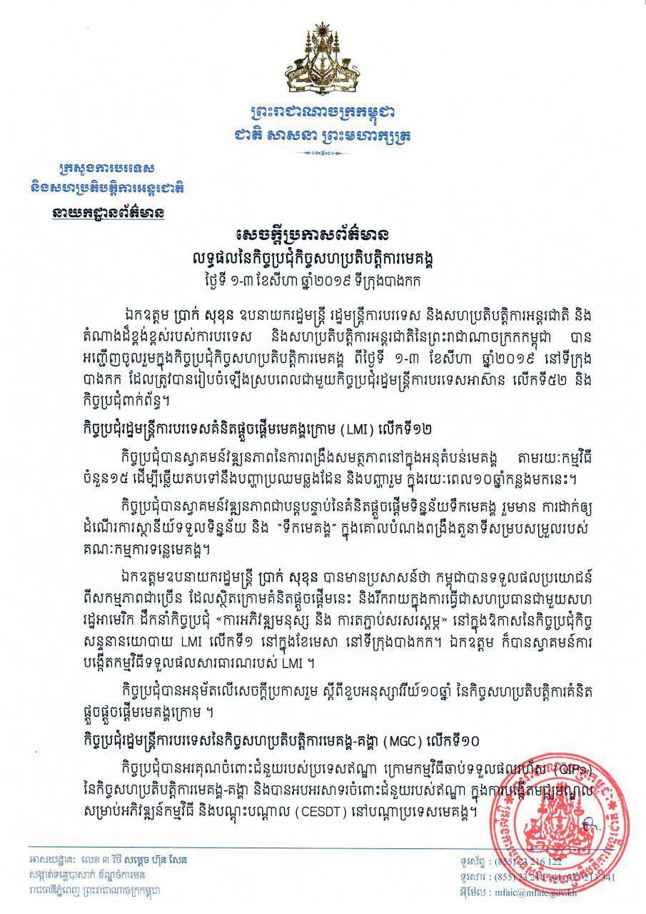ប្រមុខការទូត៖ កម្ពុជាបានទទួលផលប្រយោជន៍ ពីសកម្មភាពជាច្រើន ដែលស្ថិតក្រោមគំនិតផ្តួចផ្តើមមេគង្គក្រោម Posted on ថ្ងៃចន្ទ, 5 ខែសីហា, 2019ថ្ងៃចន្ទ, 5 ខែសីហា, 2019