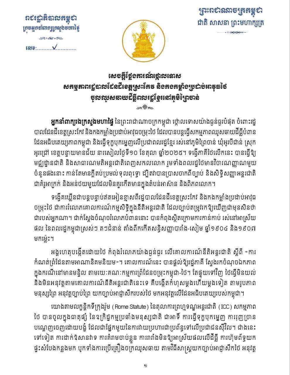 ក្រសួងមហាផ្ទៃ ចេញសេចក្តីថ្លែងការណ៍ថ្កោលទោស សកម្មភាពរដ្ឋបាលដែនដីខេត្តស្រះកែវ និងកងកម្លាំងប្រដាប់អាវុធថៃ ចូលឈូសឆាយដីធ្លីពលរដ្ឋខ្មែរ នៅភូមិព្រៃចាន់! Posted on ថ្ងៃសៅរ៍, 11 ខែតុលា, 2025ថ្ងៃសៅរ៍, 11 ខែតុលា, 2025
