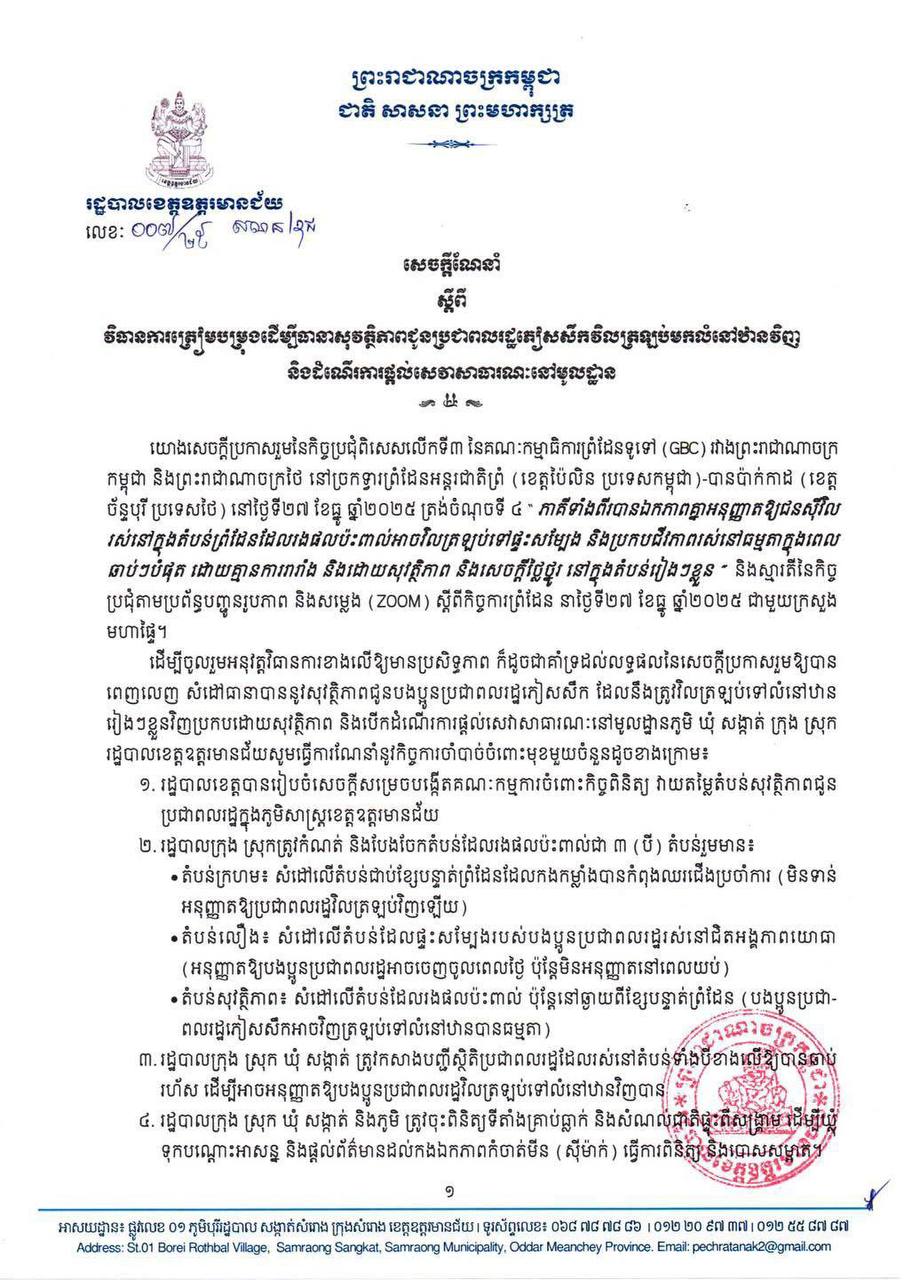 រដ្ឋបាលខេត្តឧត្តរមានជ័យ ដាក់ចេញវិធាន ១១ចំណុច ដើម្បីធានាសុវត្ថិភាពជូនប្រជាពលរដ្ឋភៀសសឹកវិល ទៅកាន់លំនៅដ្ឋានវិញដោយសុវត្ថិភាព Posted on ថ្ងៃចន្ទ, 29 ខែធ្នូ, 2025ថ្ងៃចន្ទ, 29 ខែធ្នូ, 2025