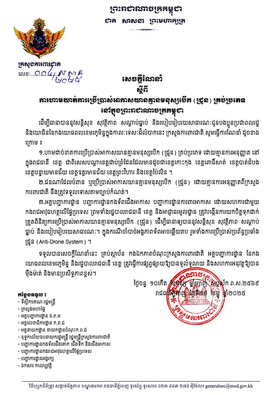 ក្រសួងការពារជាតិ ហាមការបង្ហោះដ្រូនគ្រប់ប្រភេទនៅទូទាំងប្រទេស ពិសេសខេត្តជាប់ព្រំដែនថៃ Posted on ថ្ងៃអង្គារ, 30 ខែធ្នូ, 2025ថ្ងៃអង្គារ, 30 ខែធ្នូ, 2025