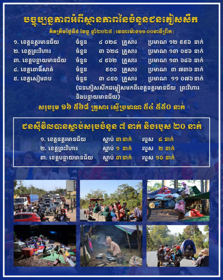 According to the same source, seven civilians have been killed and 20 others injured. Oddar Meanchey province recorded three deaths and eight injuries; Banteay Meanchey reported one death and two injuries; while Preah Vihear registered three deaths and ten injuries.