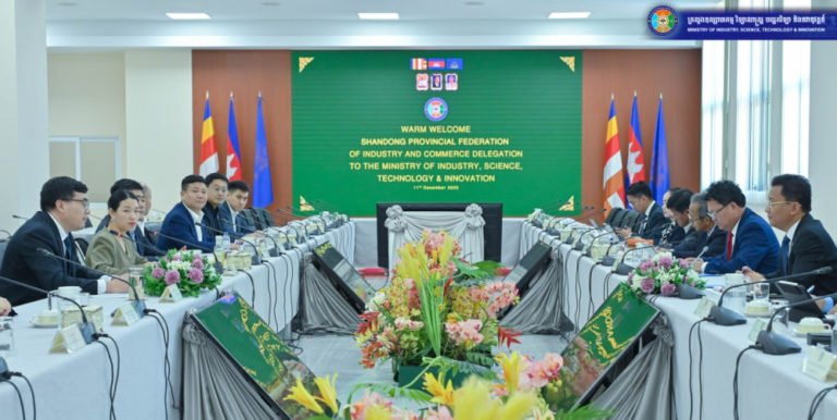 A delegation from the Shandong Provincial Federation of Industry and Commerce has met with Minister Hem Vanndy at the Ministry of Industry, Science, Technology & Innovation (MISTI) to explore new investment opportunities and potential support for Cambodian SMEs, particularly in technology and machinery upgrading.