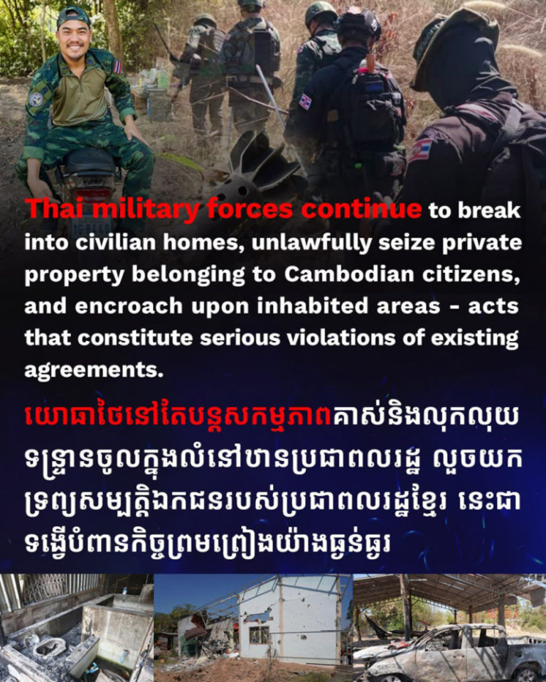 Cambodia has once again called on Thailand to immediately address and halt a series of actions by Thai forces that constitute serious violations of Cambodia’s territorial integrity and national sovereignty, according to a statement released this morning by the Press and Quick Reaction Unit (Press OCM).