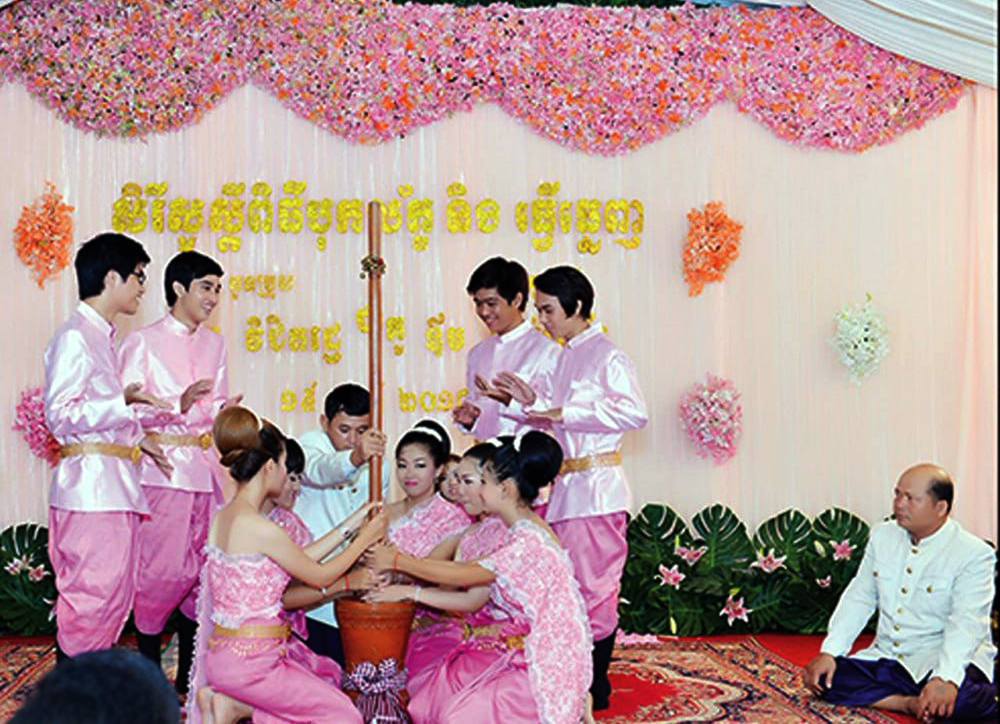 The Bok Leak ceremony, also known regionally as “Thver Thminh” or “Thver Thminh Bompenh Leak,” is a symbolic ritual representing the various tastes – sweet, bitter, sour, pungent, and salty – of married life. Traditionally, it involves the participation of family and friends across different backgrounds and is sometimes performed with artistic depictions of a journey to obtain the ceremonial ingredients.