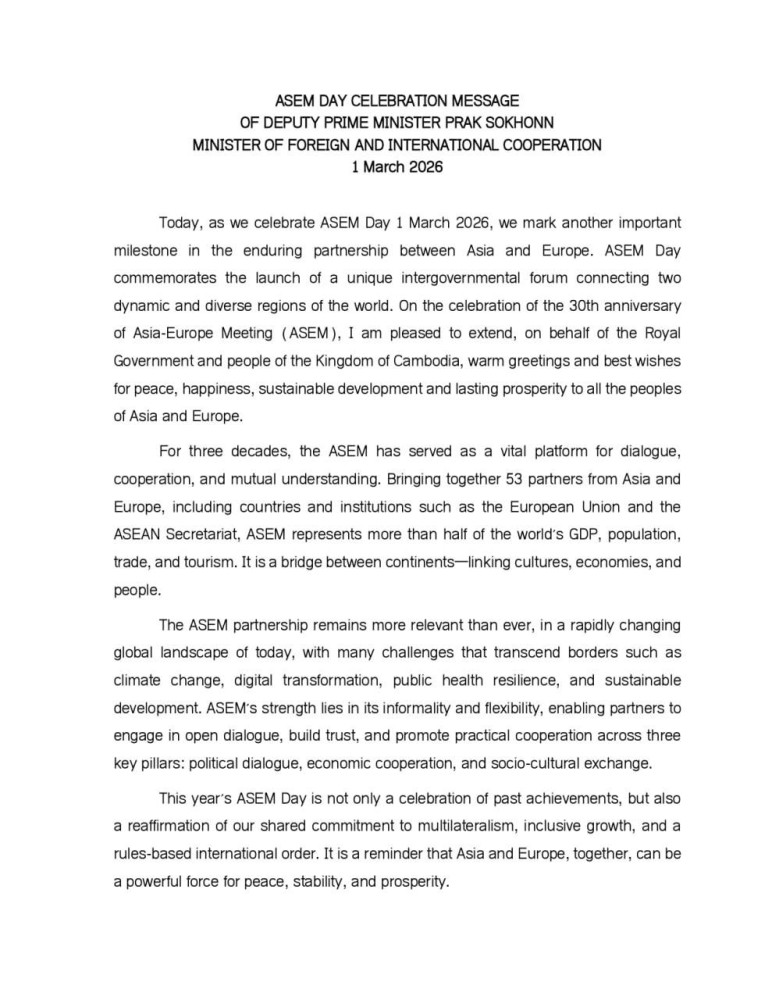 Cambodian Deputy Prime Minister and Minister of Foreign Affairs and International Cooperation H.E. Prak Sokhonn marked ASEM Day on Mar. 1, 2026, highlighting the enduring partnership between Asia and Europe and commemorating the 30th anniversary of the Asia-Europe Meeting (ASEM).