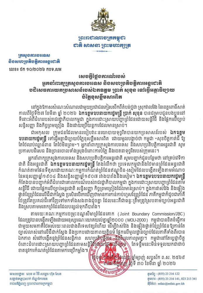 According to the statement, H.E. Prak Sokhonn had reaffirmed the Royal Government’s consistent position of resolving border issues peacefully, based on international law, existing treaties, and established mechanisms.