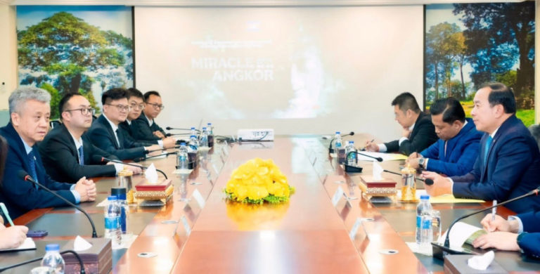 H.E. Huot Hak, Cambodian Minister of Tourism, received a courtesy call here on April 4 from Mr. Lu Wei, Chairman of the Board and representative of Angkor International Airport Investment (Cambodia) Co., Ltd., for a working discussion and progress update on the development of new tourism products.