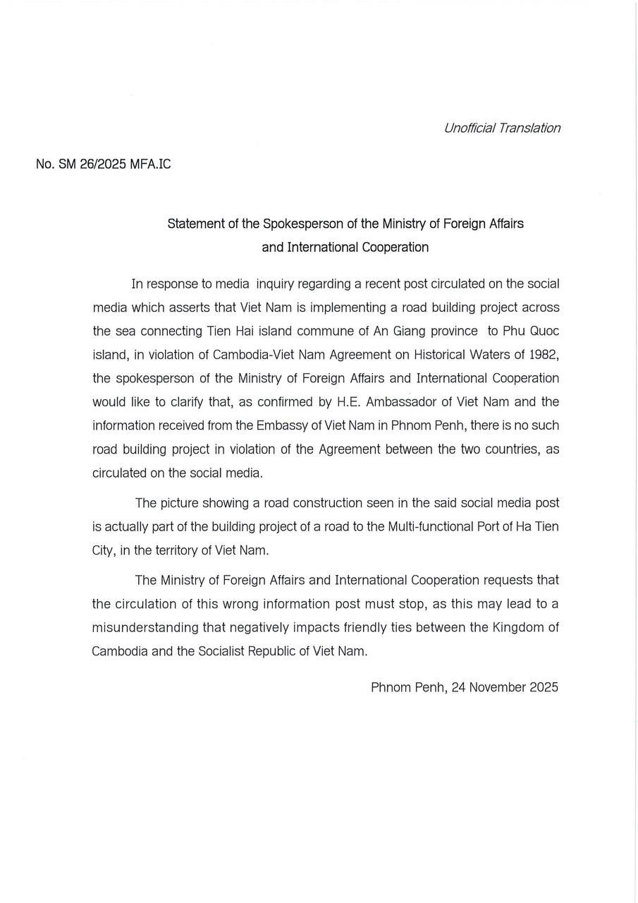 Statement of the Spokesperson of the Ministry of Foreign Affairs and International Cooperation In response to media inquiry regarding a recent post circulated on the social media which asserts that Viet Nam is implementing a road building project across the sea connecting Tien Hai island commune of An Giang province to Phu Quoc island Posted on Monday, 24 November, 2025